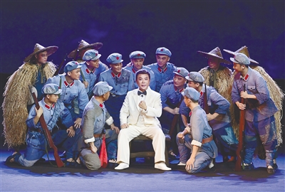 在主题展现上,《红旗不倒》始终围绕着“红旗”展开,所有主角、出场人物,以及故事情节、舞台设计都与红旗相呼应。先是冯母护旗传旗,接着是冯白驹的妻子王惠周送旗参加红军,再到冯白驹扛旗、接旗、捧旗、举旗,一系列“红旗不倒”的舞台具象表现已升华为精神象征,这既是革命信仰的力量,也是人民群众支持的力量。