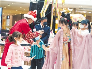 ◀在cdf海口国际免税城“情定中免·爱上海口”元宵换花音乐节现场,小朋友们正在和身穿汉服的演员互动。 本报记者 杨忠凯 摄