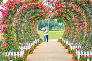 ②在海口万绿园,市民在花卉搭建的心型拱门中打卡留念。