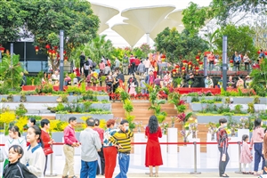 在万绿园南门,一座座由三角梅搭建成的心型拱门成为园区热门打卡点。海口市万绿园管理处主任李雯介绍,近期气温回暖后,园区花卉更加艳丽,入园来踏青赏花的市民游客明显增多。