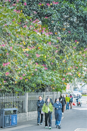 ④在海口骑楼老街道路旁,一丛丛宫粉紫荆伸出院墙竞相开放,给街道增添了一份浪漫。 (本版图片均由本报记者 孙士杰 摄)
