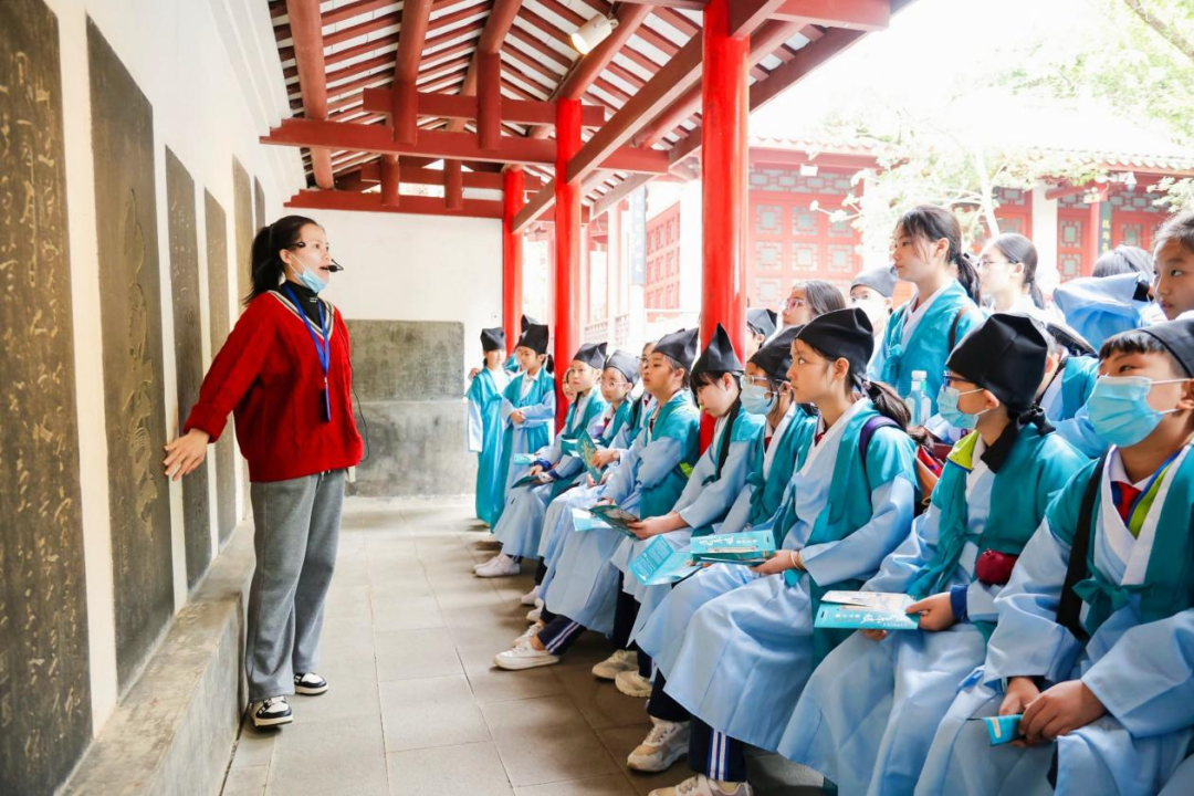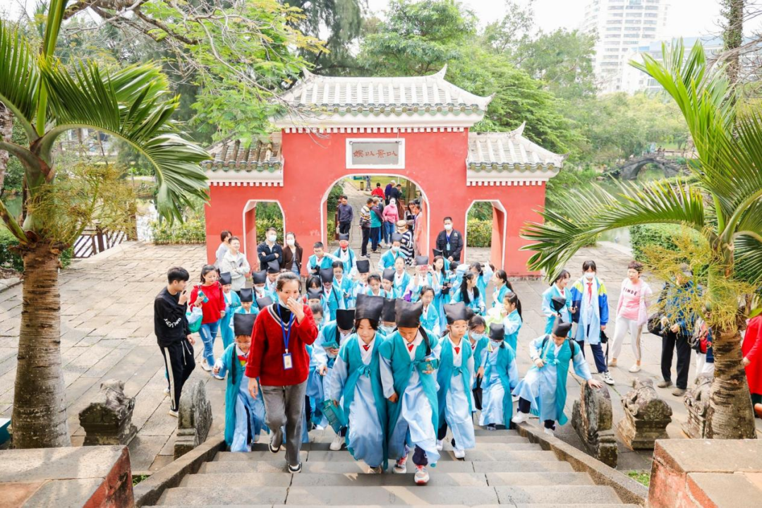 2月25日至26日,由海口市第二十五小学、海口市琼山第三小学的师生组成的研学队伍,在领队老师和讲解员的带领下身着宋代学生服,于海口市五公祠体验“宋代学堂的一天”。