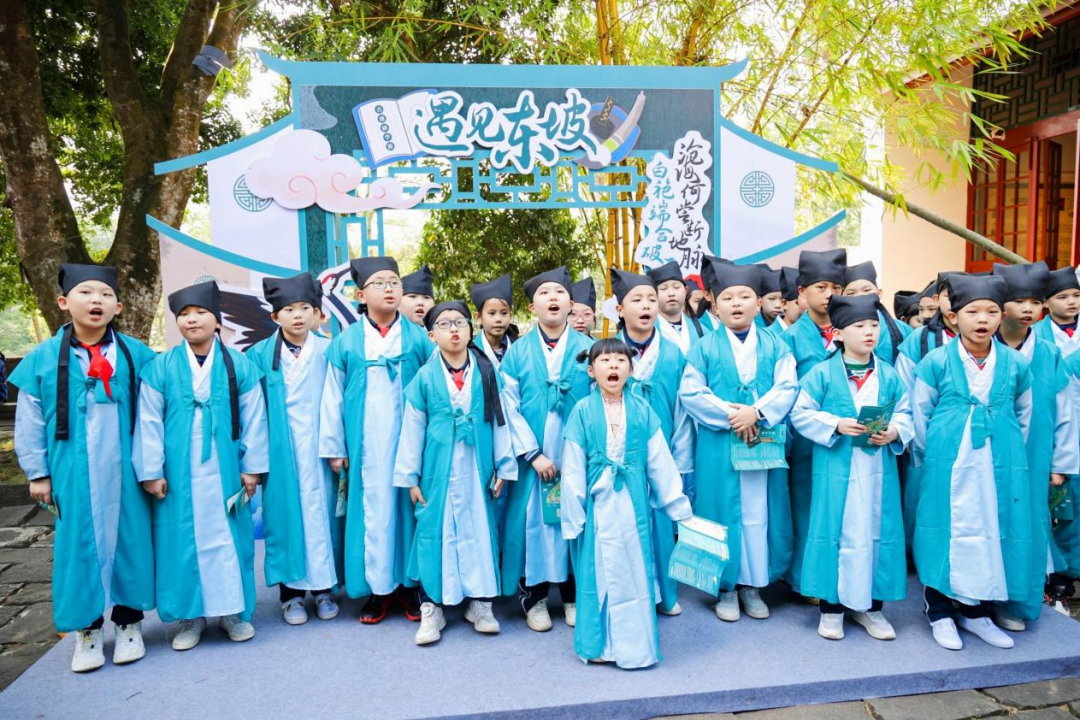 现场的学生们积极的参与互动,纷纷上台展现“本领”,背诵东坡先生的诗词。在理解“奋厉当世忠诚有为,报国之心死而后已”的东坡文化内涵后,海口琼山三小现场十余名孩子们自发上台,背诵南宋爱国将领岳飞的《满江红》。“……待从头、收拾旧山河,朝天阙”孩子们的读书声回荡在学圃堂内。