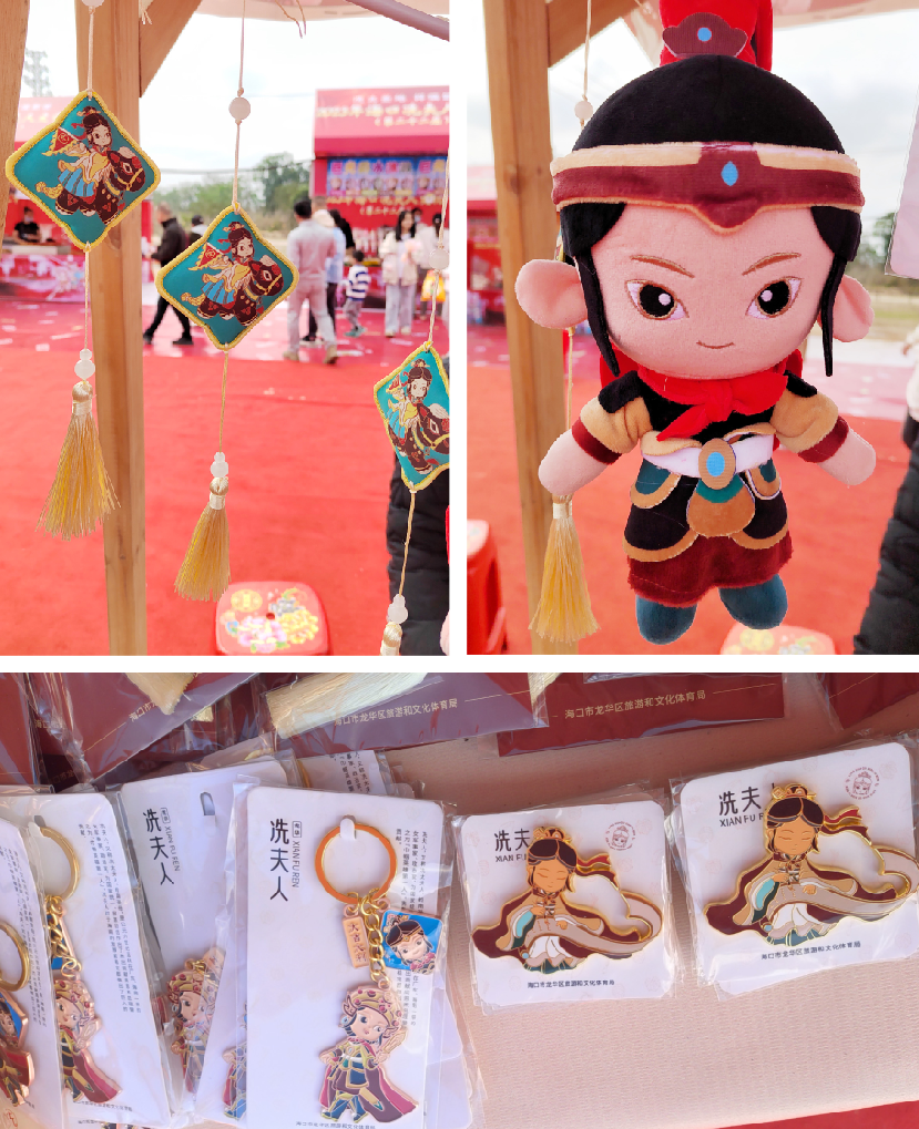 值得关注的是,除了当地的特色农产品,还有龙华区推出的文创产品展销展台。英姿飒爽的冼夫人卡通手办立像,惟妙惟肖的玩偶形象,创意团扇,御守好运符和五福飘带等十款周边商品吸引了不少带着孩子来的家长。通过椰雕文创设计大赛推出的椰雕周边商品独具特色,只见一块块的椰子壳,通过手工艺人的巧手,变成了特色车载香薰,椰子手提包,椰壳首饰等物件。民俗文化与创意产品融合,让游客们既感受到了传统的信俗韵味也感受到了现代的文创气息。