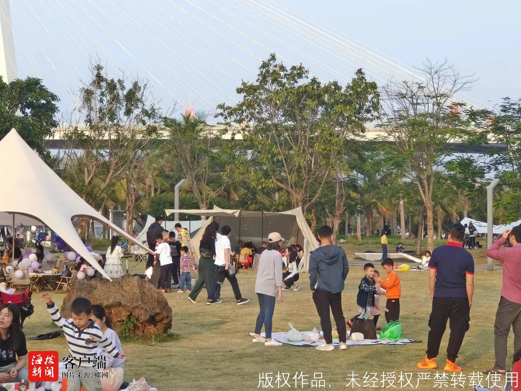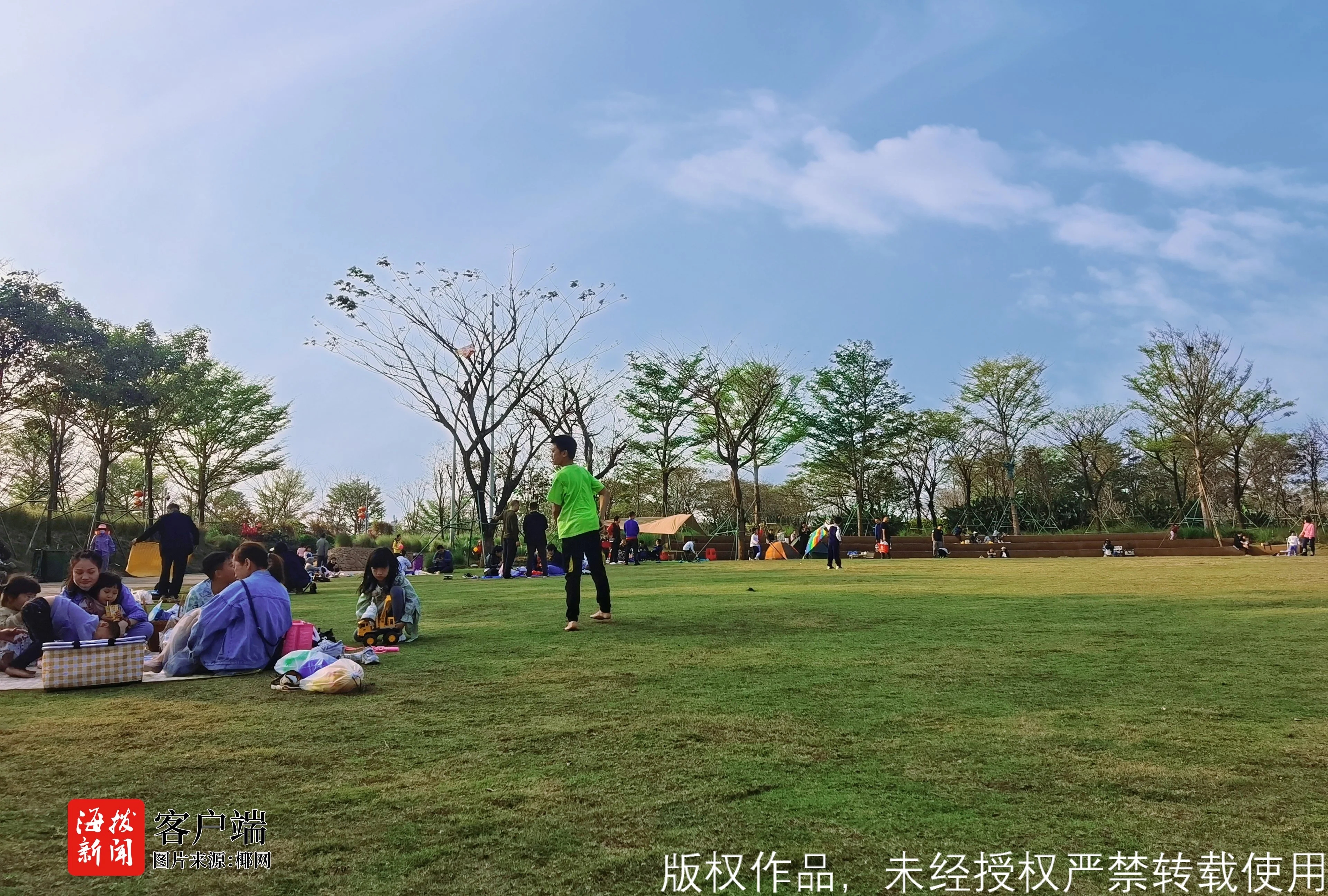 “今天天气真好!一起去看日落吧!”“今天天气不错,适合出门‘觅春’,到海口骑楼买点斑斓糕、椰子水、清补凉等特色美食,这个周末会过得特别惬意。”“春天的天气可真好,阳光温暖,春风和煦,让我流连忘返。”……每逢周末,海口世纪公园的草坪上就会搭起许多帐篷,不少市民和游客聚在一起,有的弹吉他、有的吃美食、有的玩游戏,孩子们在草地上放飞五颜六色的风筝,快乐地玩耍。