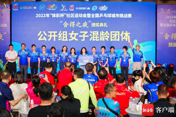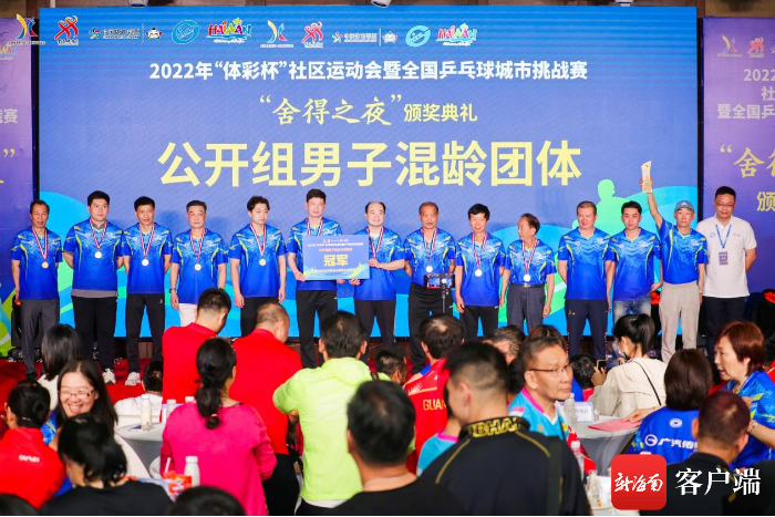 南国都市报3月13日消息,3月12日晚,2022年“体彩杯”社区运动会暨全国乒乓球城市挑战赛闭幕式“舍得之夜”在海口举行,经过3天角逐,公开组、乒协组、公务员组3个组别,团体、单打2个大项、15个小项比赛的比赛已全部完赛。