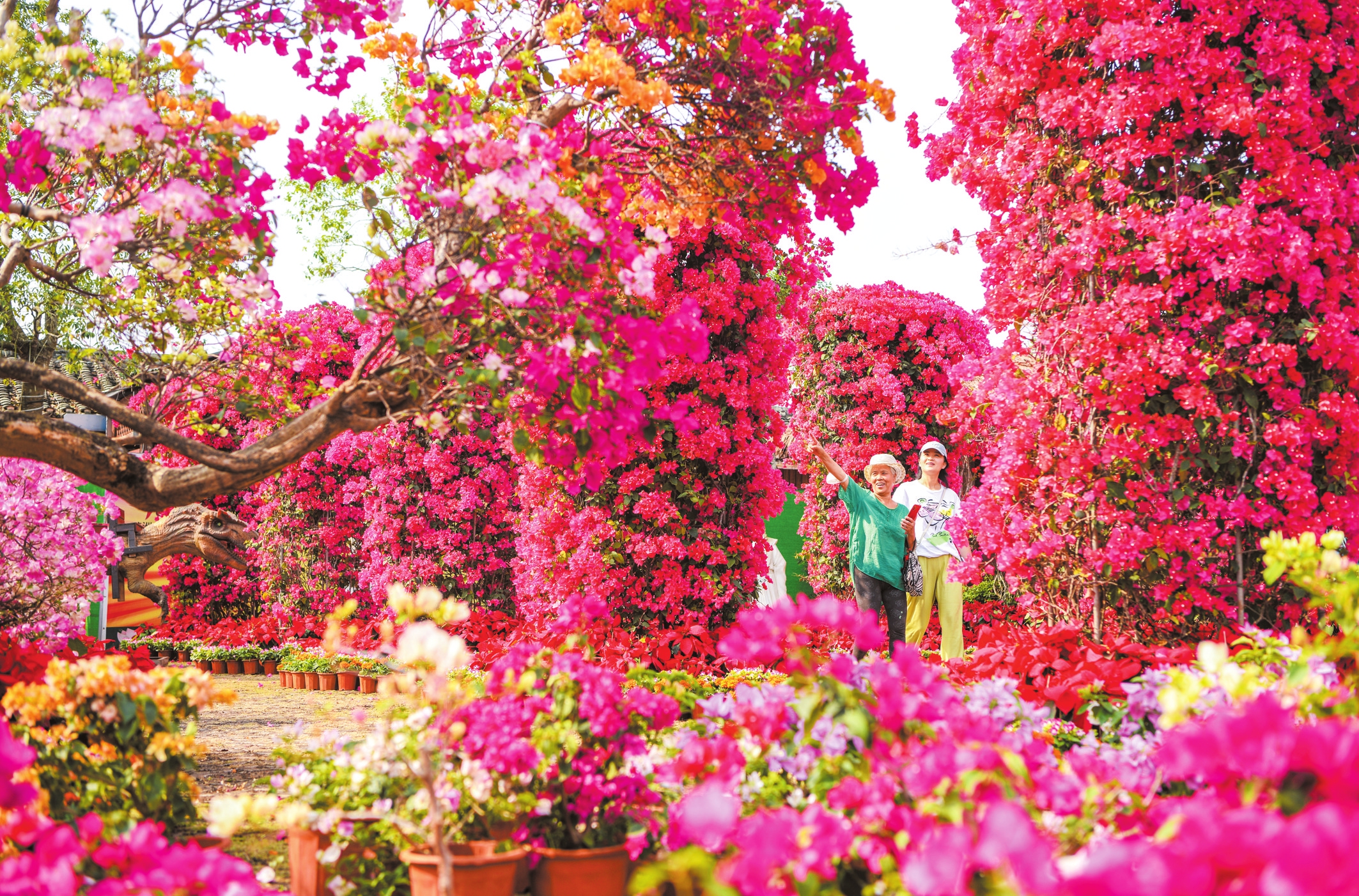①进入3月,海口城乡处处百花争艳,吸引大量市民和游客前来赏花观景。这是3月19日,市民游客在琼洲文化风情街特色三角梅展赏花。 本报记者苏弼坤摄