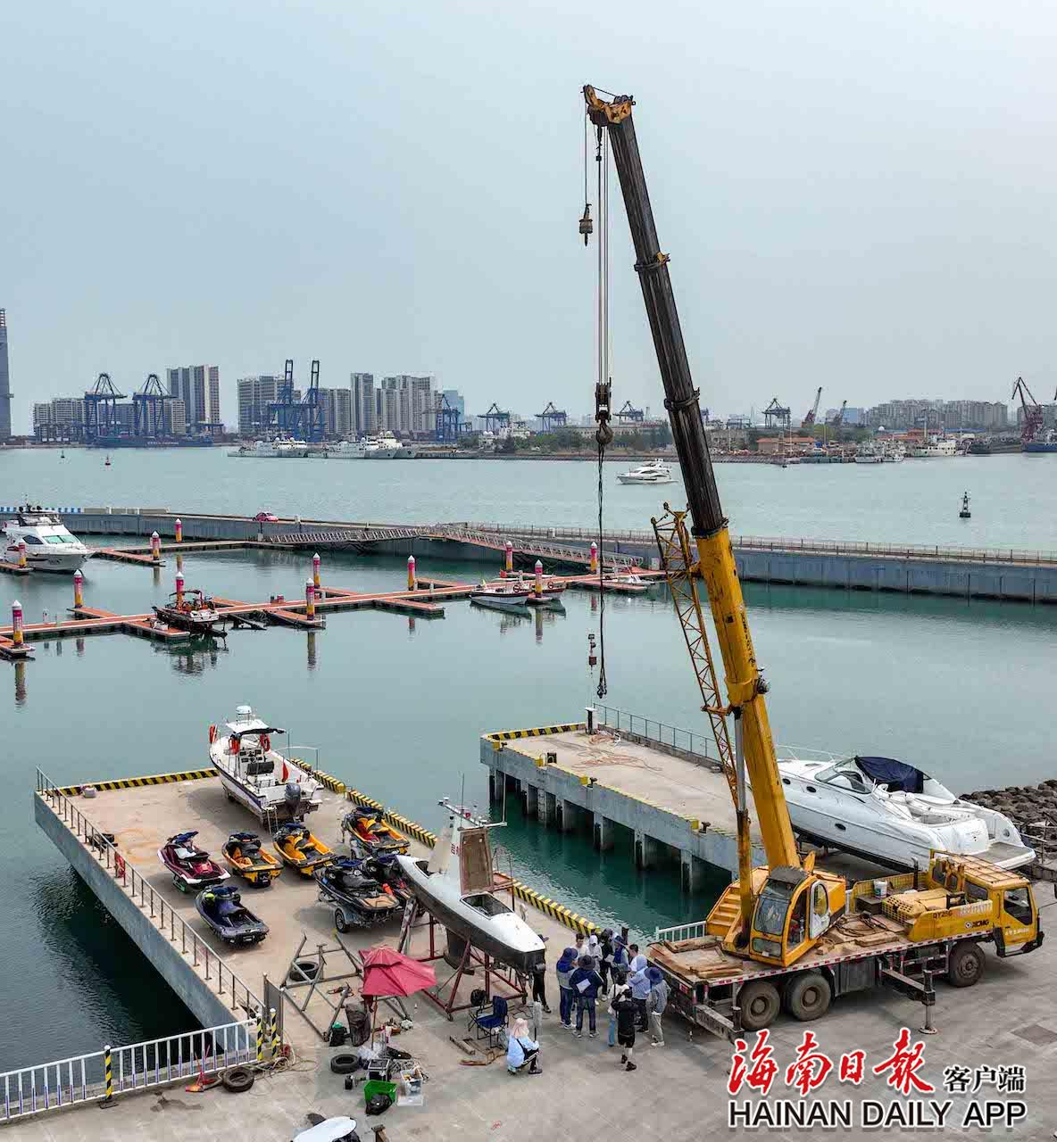 2023年4月6日,在海口市国家帆船基地公共码头,工作人员抓紧时间布展,参展的游艇陆续抵达。