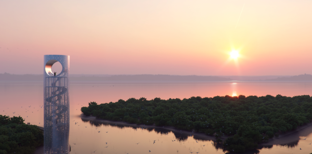 其设计灵感来自红树林的斑驳树影,通过节制微妙且独特的标志性,以自然方式融入周边环境,外观为简洁纯净的圆柱形态,立面如海上树影,顶部如梢间明月,主要承担防火防灾、人为活动与鸟类活动及动植物资源生态监测功能,兼具科普研学、观景摄影等功能。
