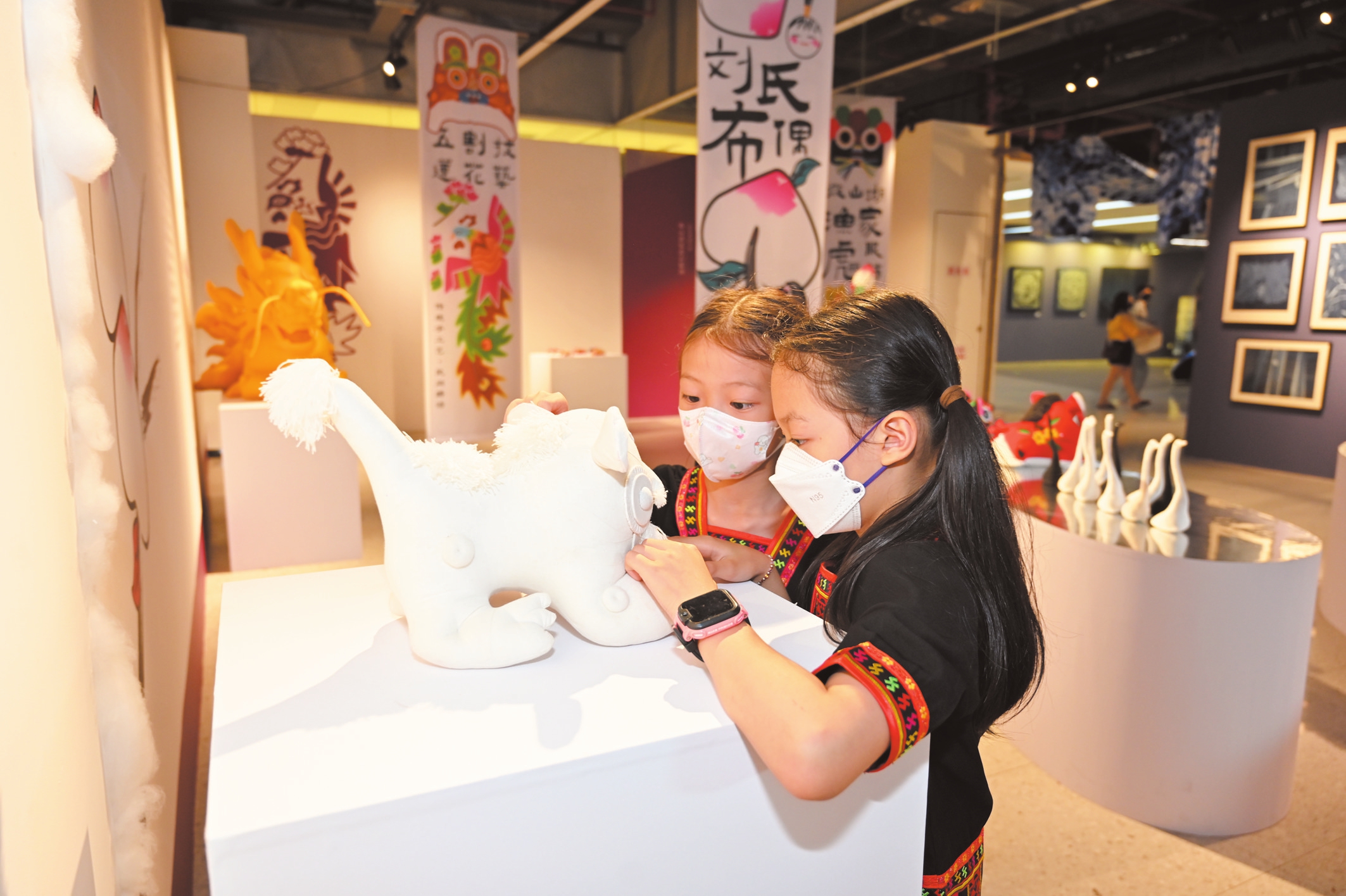 ▶“五一”期间,2023海南锦绣世界文化周非物质文化遗产传统织绣印染技艺项目精品展在海口举办。图为观展小朋友被可爱的布偶吸引。本报记者石中华摄