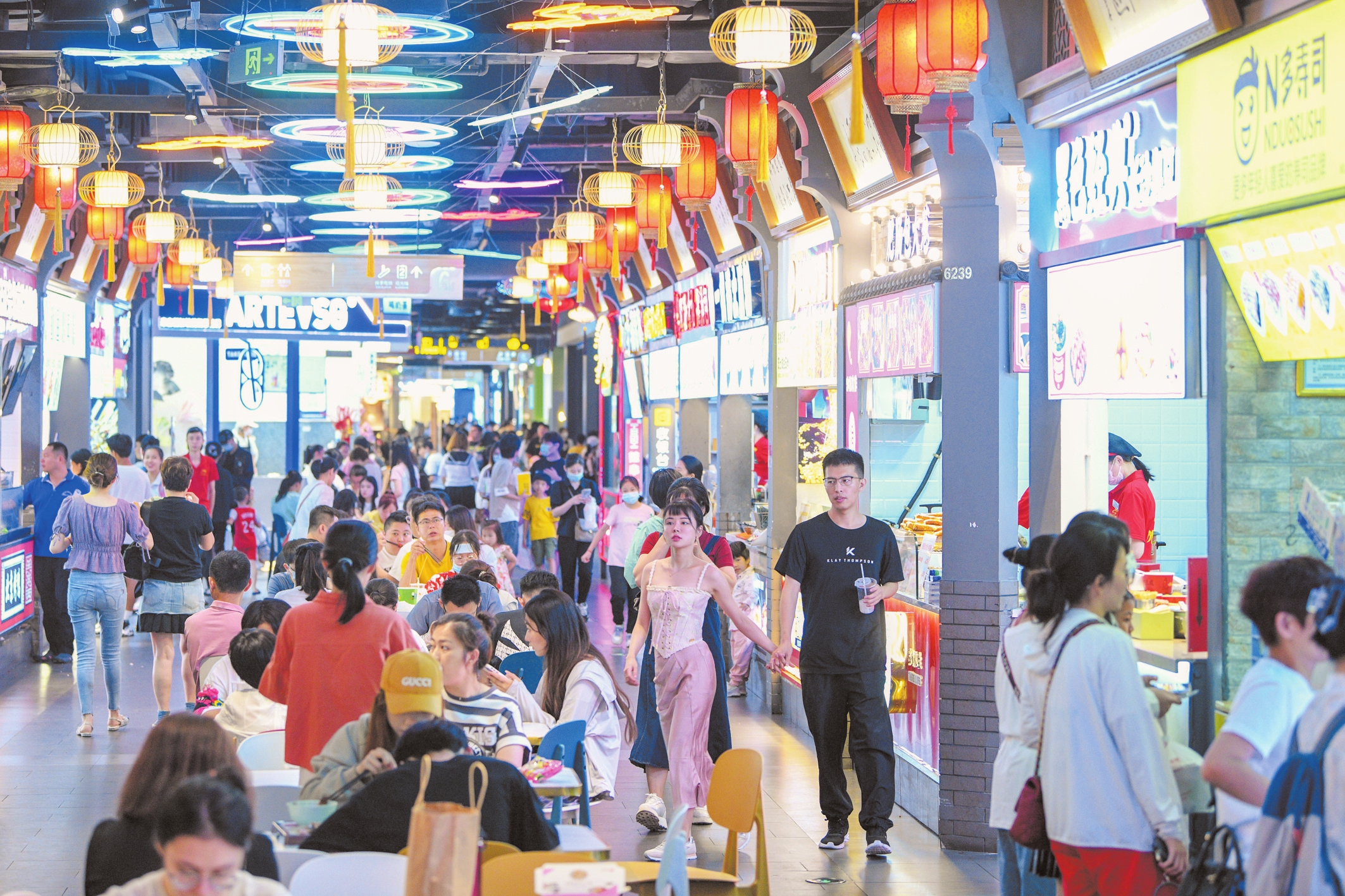 ▲5月3日,在友谊阳光城6楼的小吃街,不少市民游客前来品尝美食。