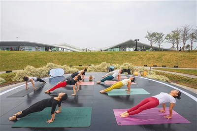 市民在海口湾天空之山驿站一带练瑜伽。海南日报记者 李天平 摄