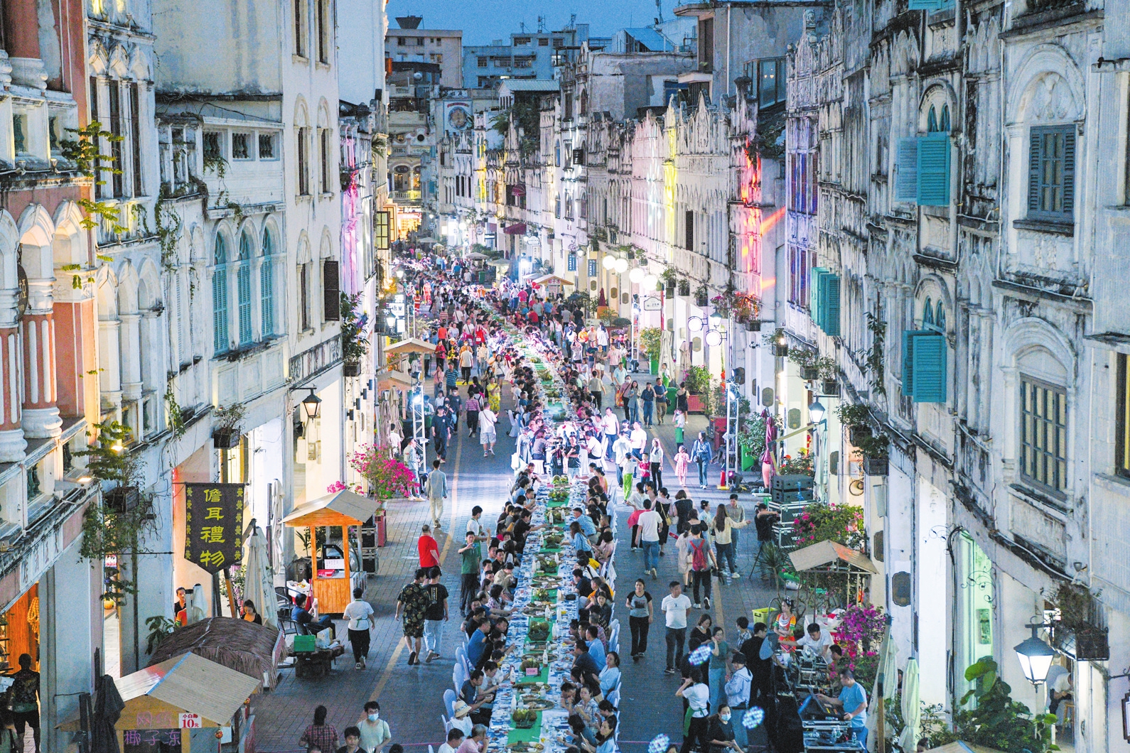 ①“琼州家宴千年文俗”琼韵之夜长桌宴活动在海口骑楼老街举行。