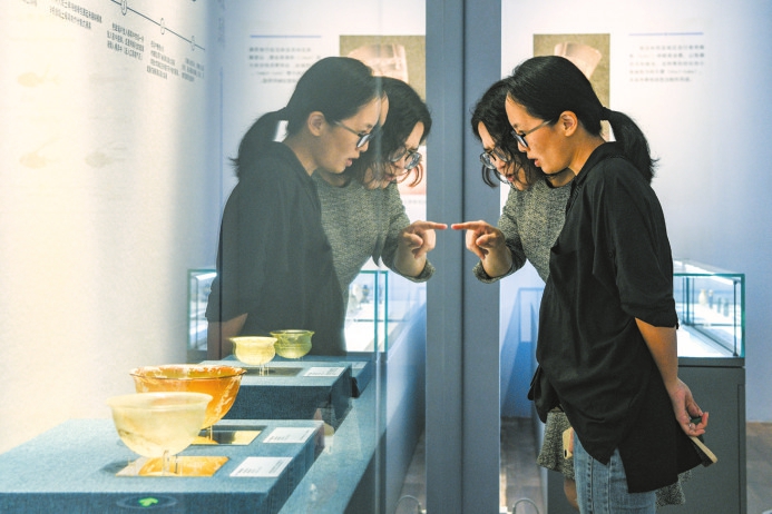 ⑤“瑠光异彩——丝路上的古玻璃器艺术展”在海南省博物馆开幕,精美展品吸引市民参观。