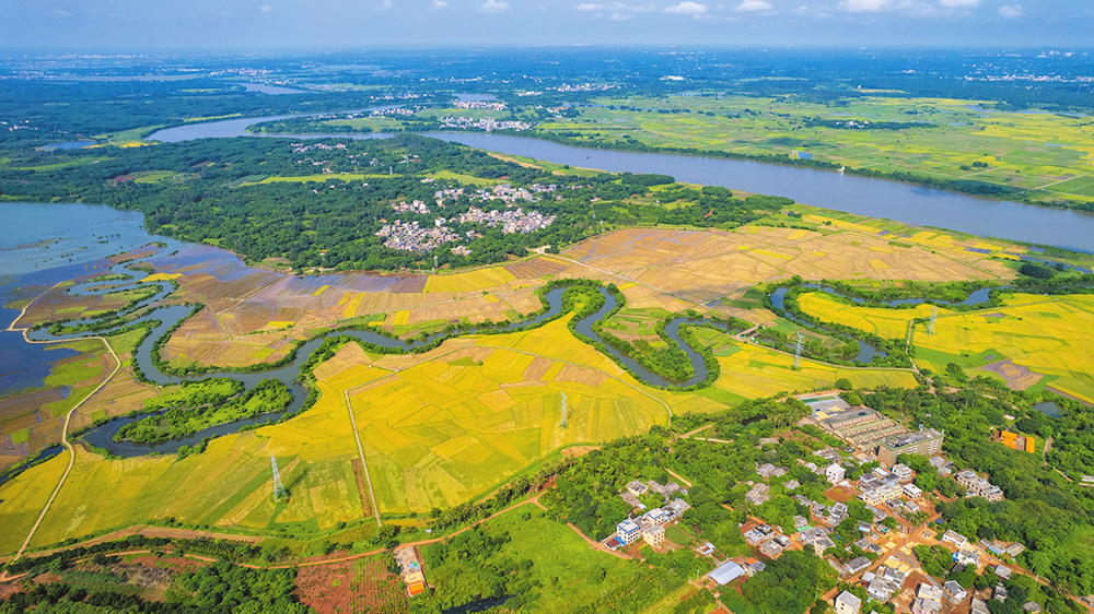 风吹稻浪,稻谷飘香。5月16日,在琼山区云龙镇的三十六曲溪湿地公园内早稻陆续成熟,蜿蜒曲折的河道两岸约2000多亩早稻一片金黄,当地村民抓住雨过天晴的好时机加紧抢收,轰隆隆的收割机来回穿梭,一幅美丽的丰收画卷尽收眼底。 本报记者 张俊其 摄