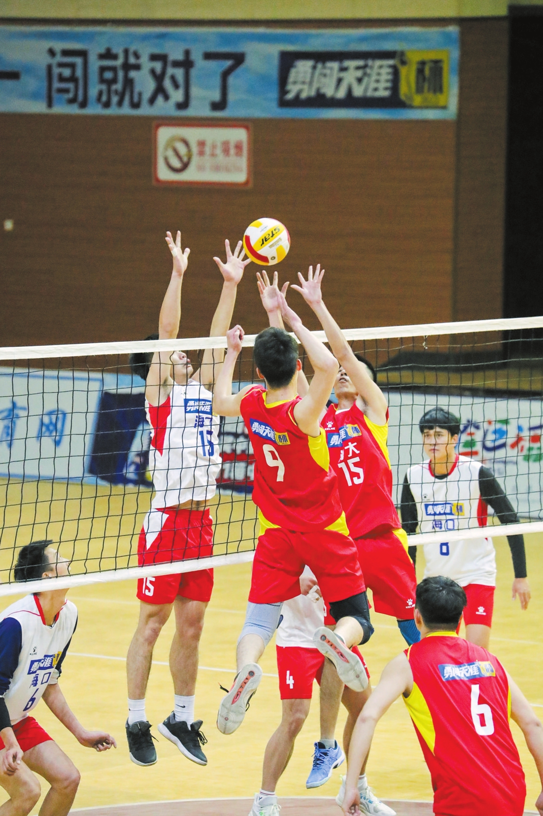 2022年12月,海南省排球联赛比赛中,队员正在扣球。