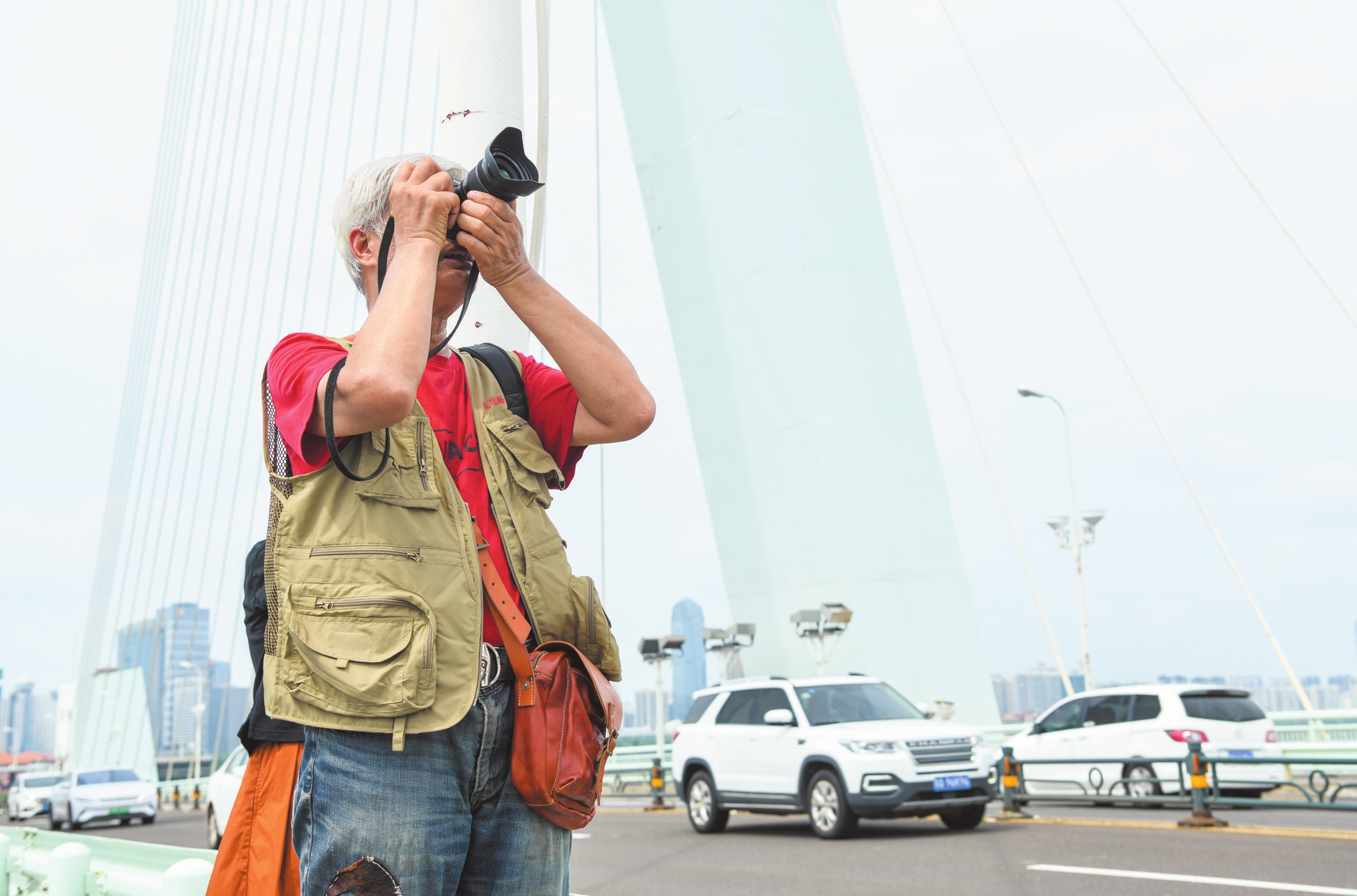 摄影师宋刚明在海口世纪大桥上创作。本报记者 康登淋 摄