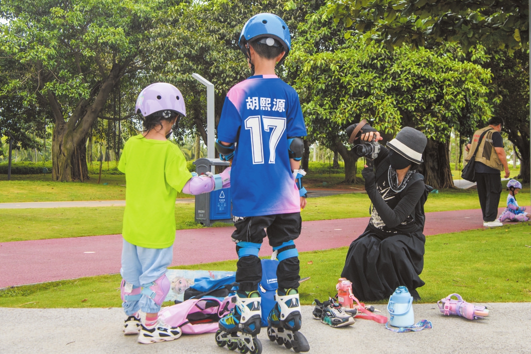 摄影师在世纪公园拍摄正在玩轮滑的孩子。本报记者 陈长宇 摄