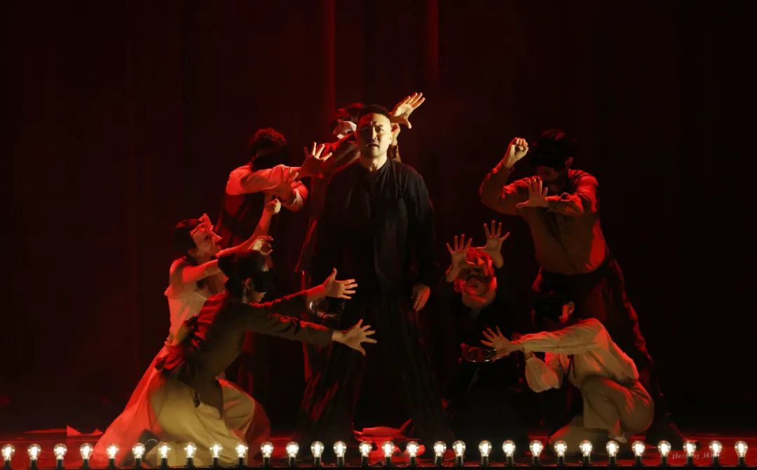 赵淼的作品风格一向有着高度的假定性,无论是早期的《水生》《化水》,还是《回廊亭杀人事件》和《被嫌弃的松子的一生》,经常是一名演员分饰多个角色,突出形体剧的概念。《虚像的道化师》延用“回廊亭”与“松子”的原班人马,舞台设计上虽然简约,却可以借由演员们诗意的身体和角色的自由转换,展现出悉数登场的众多人物,或借助某种形体与道具的象征,让观众可以穿过具象,看到人物心理的视像。