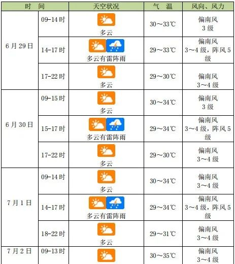 预计,6月29日~6月30日,多云,局地午后有雷阵雨;7月1日~7月2日,受偏南气流影响,多云,午后有雷阵雨。
