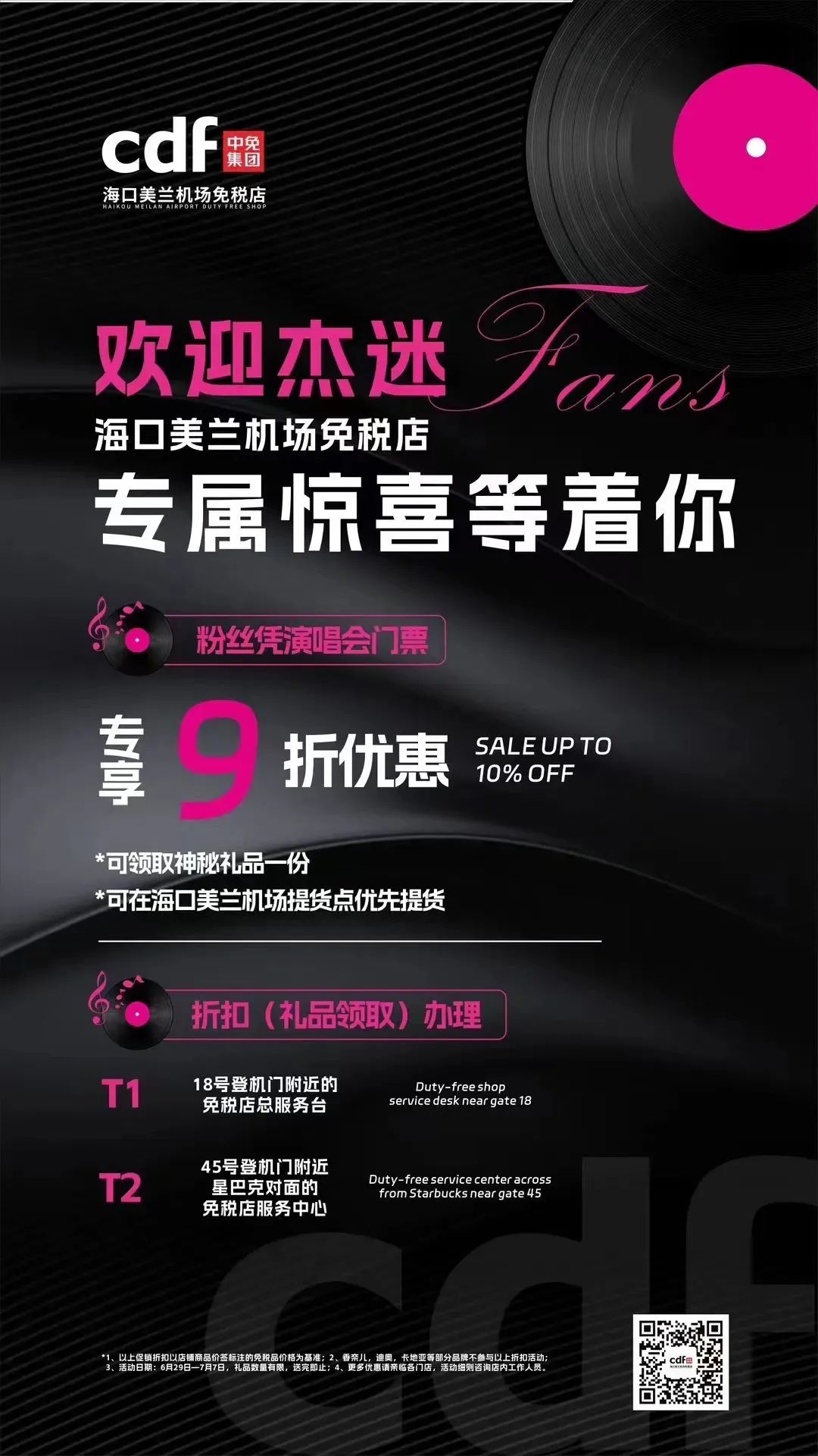 cdf海口日月广场免税店涵盖了众多国际时尚品牌、香化品牌,珠宝腕表品牌,3C电子产品及进口酒水等,近700个国际知名品牌交相辉映,6月26日-7月5日,杰迷持演唱会门票到店购物享免税正价商品9折优惠(总服务台办理)。