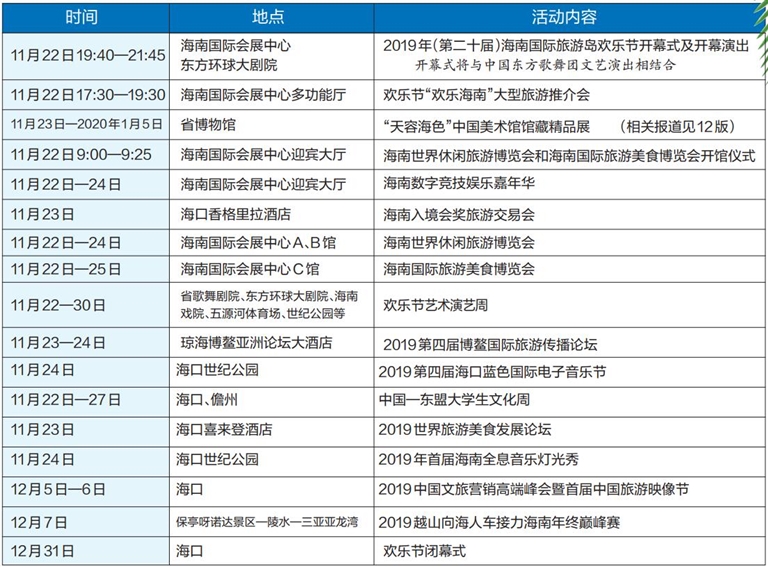 11月21日讯,2019年(第二十届)海南国际旅游岛欢乐节于11月22日正式启幕,将持续至12月31日。本届欢乐节由包括开幕式在内的17项主体活动,设海口主会场和三亚、儋州、琼海、万宁、陵水5个分会场组成,推出集文化、旅游、赛事、节庆于一体的欢乐盛宴。