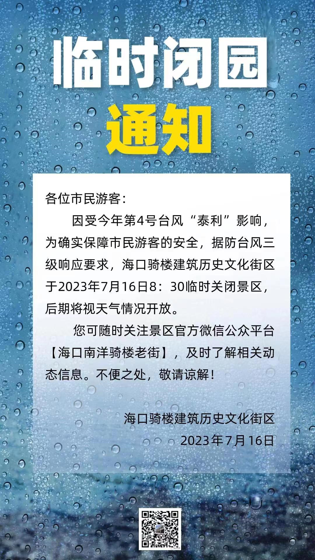 受今年第4号台风“泰利”的影响,为确保游客安全,海口假日海滩旅游区定于2023年7月16日起暂停开放,恢复开放时间另行通知。