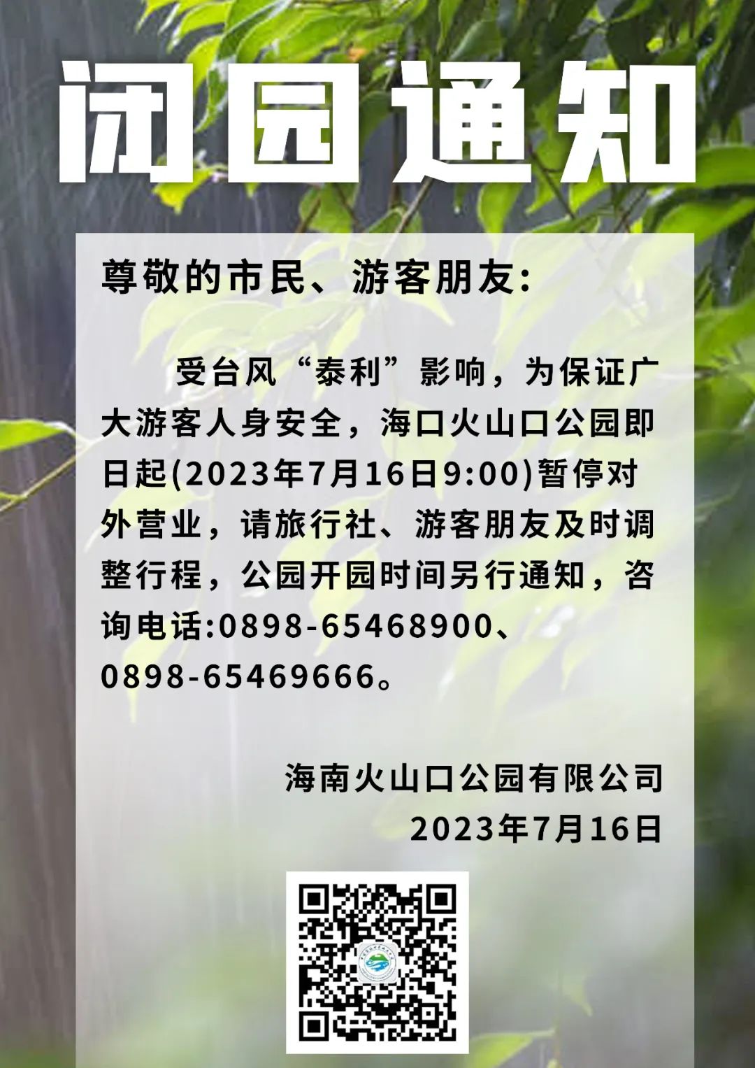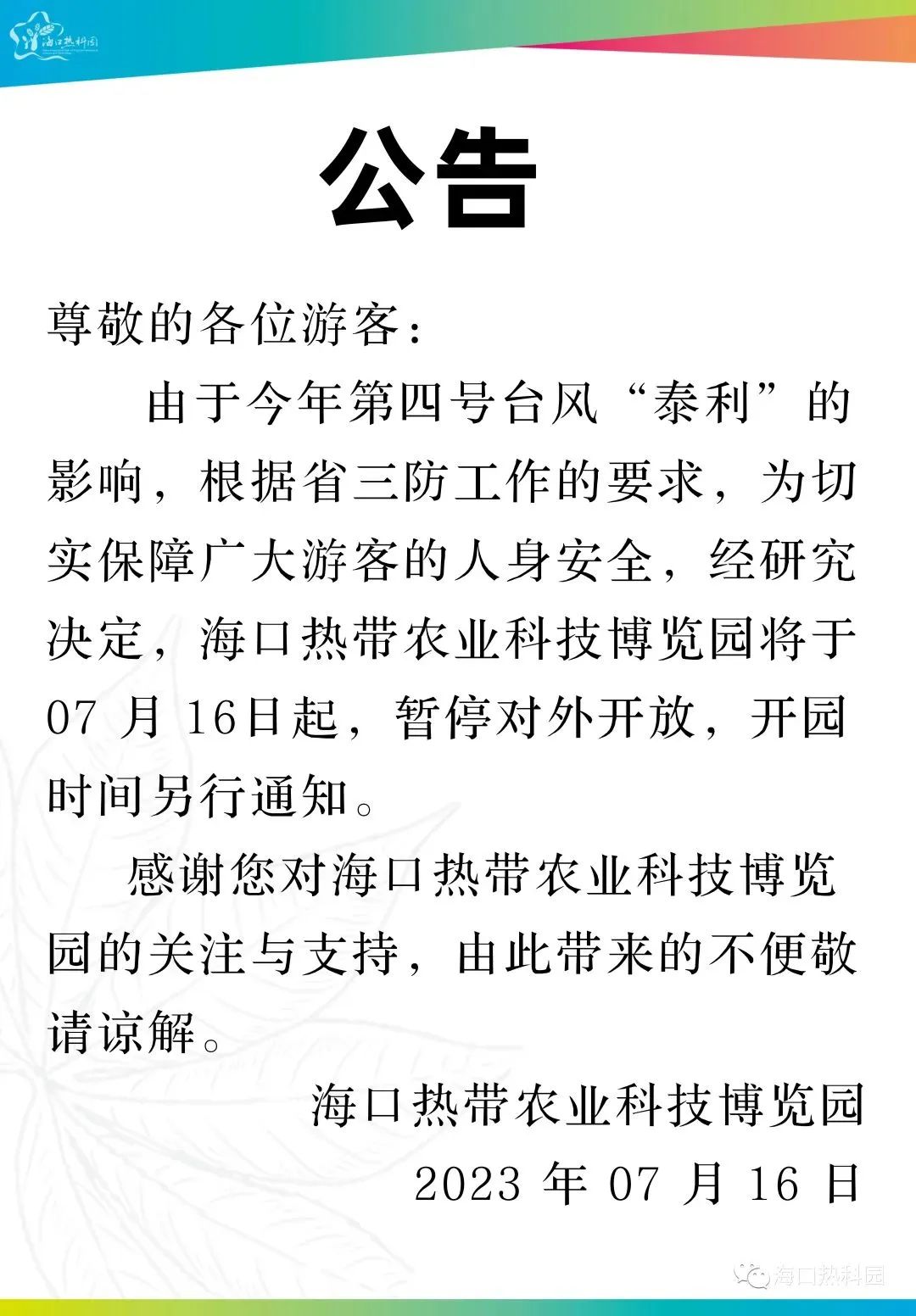 为保障市民游客人身及财产安全,桂林洋国家热带农业公园自2023年7月16日12:00起临时闭园,景区恢复开放时间另行通知。