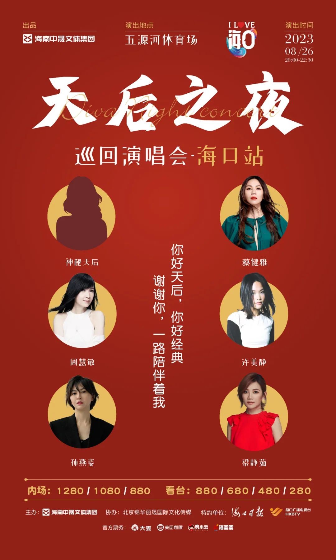 8月26日天后之夜巡回演唱会海口首站即将梦幻开启。蔡健雅、周慧敏、许美静、孙燕姿、梁静茹6位金曲“天后”,将齐聚海口五源河体育场,为观众呈现华语乐坛巅峰之夜。