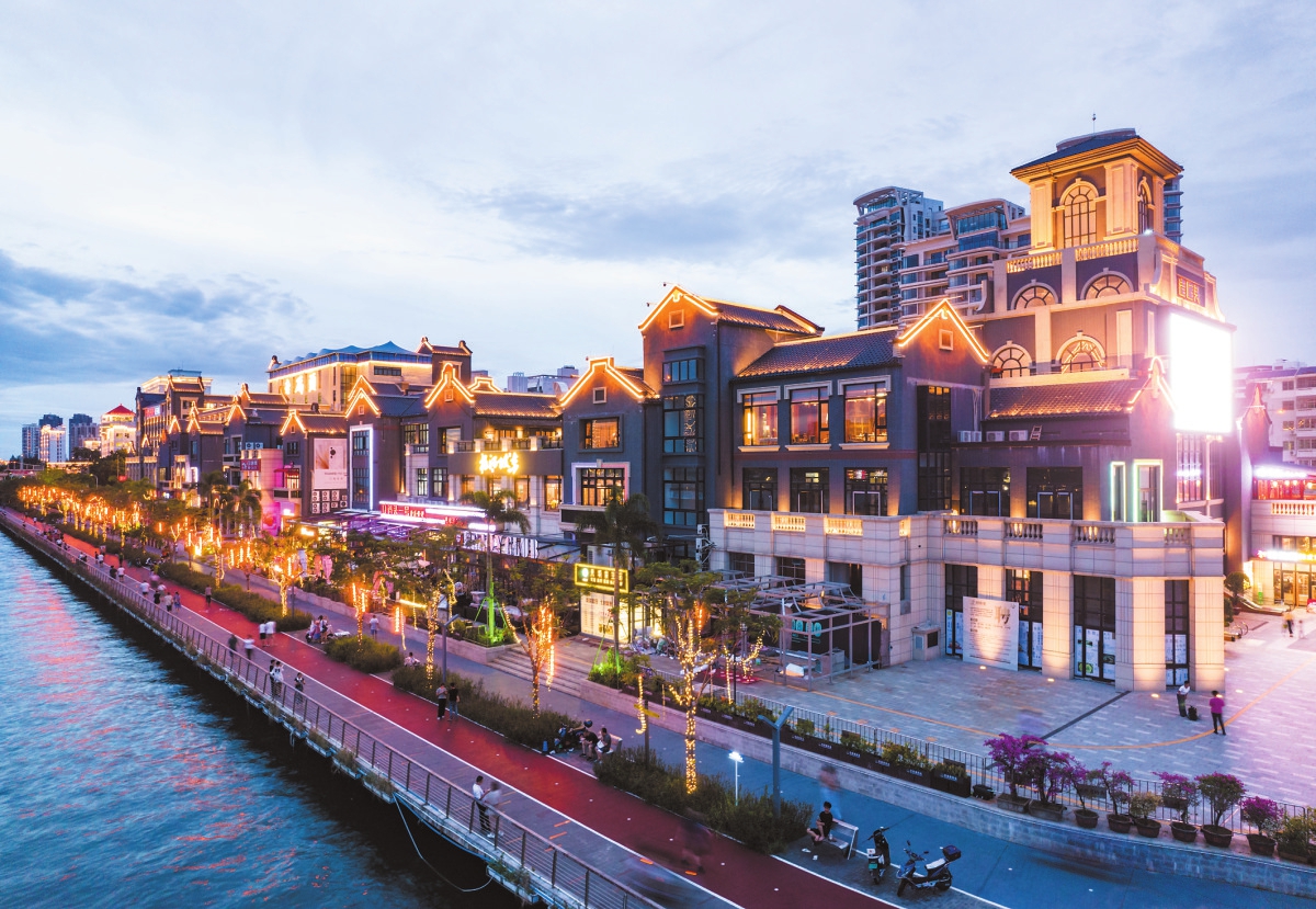 一面临海,三面临路,古典建筑错落有致,深灰色的墙衣搭配富有年代感的瓦片,复古优雅的气韵与现代时尚风情相融,行走于海口东坡老码头风情商业街,仿佛“穿越”到了宋朝。华灯初上,烟火升腾,藏身于老码头内的百味小吃街迎来了八方食客。“在这里不仅感受到了海口的诗意与浪漫,还品尝了传统的特色小吃,令人流连忘返。”来自北京的游客费先生说道。
