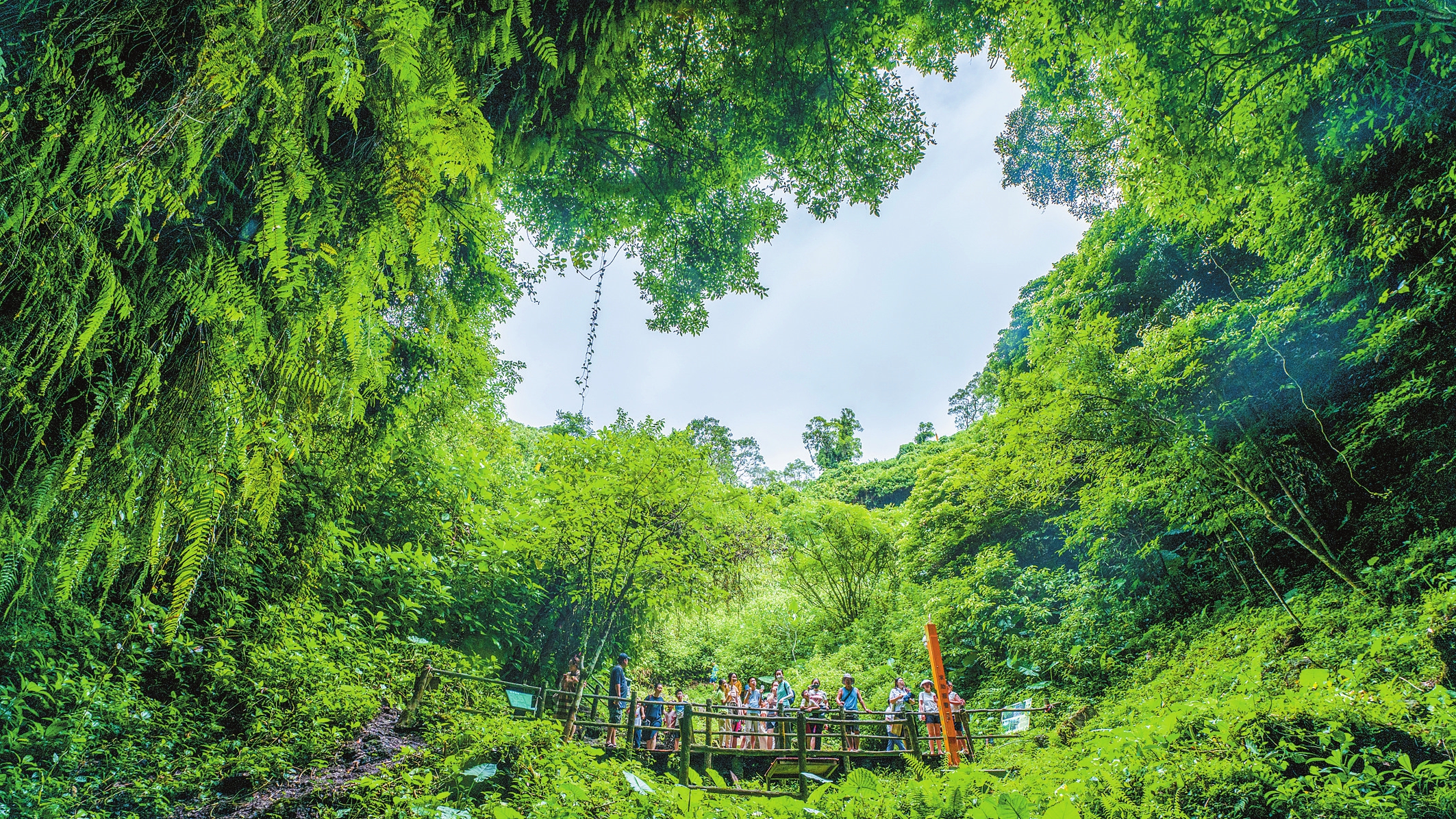 8月7日,火山口公园内,不少亲子家庭沿着栈道行走观光,驻足欣赏,享受自然的美好。