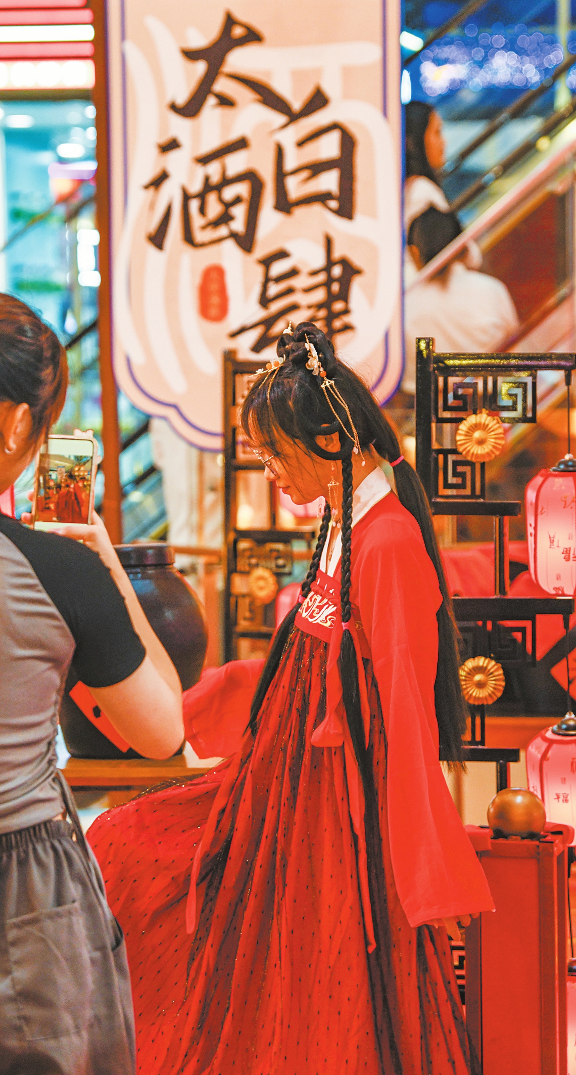 8月21日上午,位于龙华区金龙路的友谊阳光城六楼中庭,红色调的美陈,红黄相间的灯笼,团扇、油纸伞……各类元素尽显古风雅韵,弹古筝的演员仙气飘飘,余韵悠长。身着华美汉服、妆容精致的市民游客,行走在古香古色的场景中,仿佛穿越千年时光。