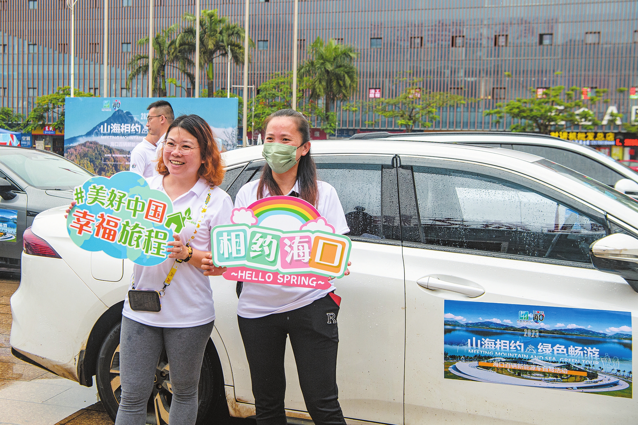 5月13日,“山海相约、绿色畅行”海口百辆新能源车自驾活动启动仪式在海口举行,手持标语的车主为活动顺利进行打气加油。本报记者 陈长宇 摄