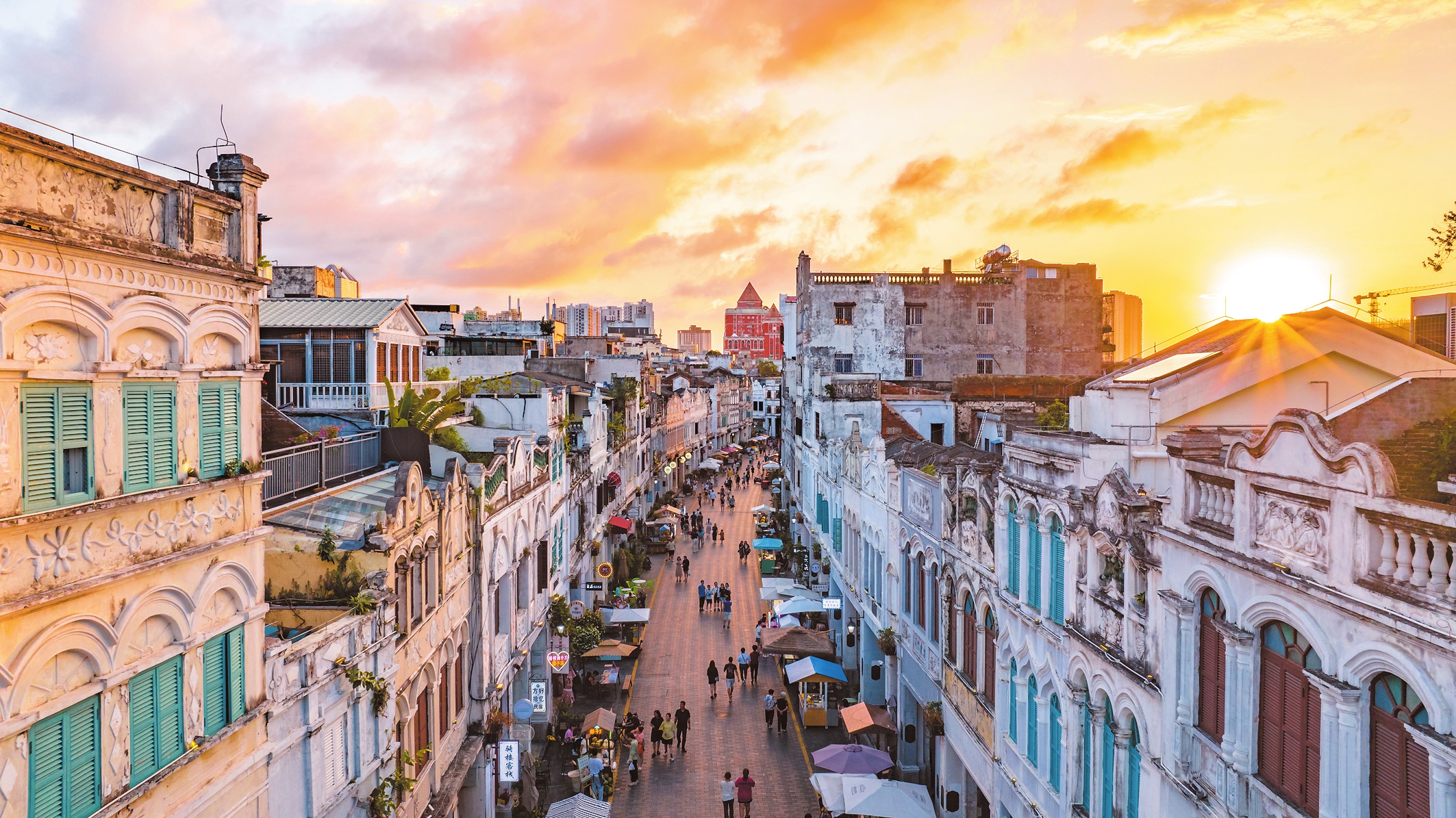 在夕阳余晖映照下,众多游客漫步于海口骑楼老街,感受海口独特的历史文化。本报记者 杨鹤 摄