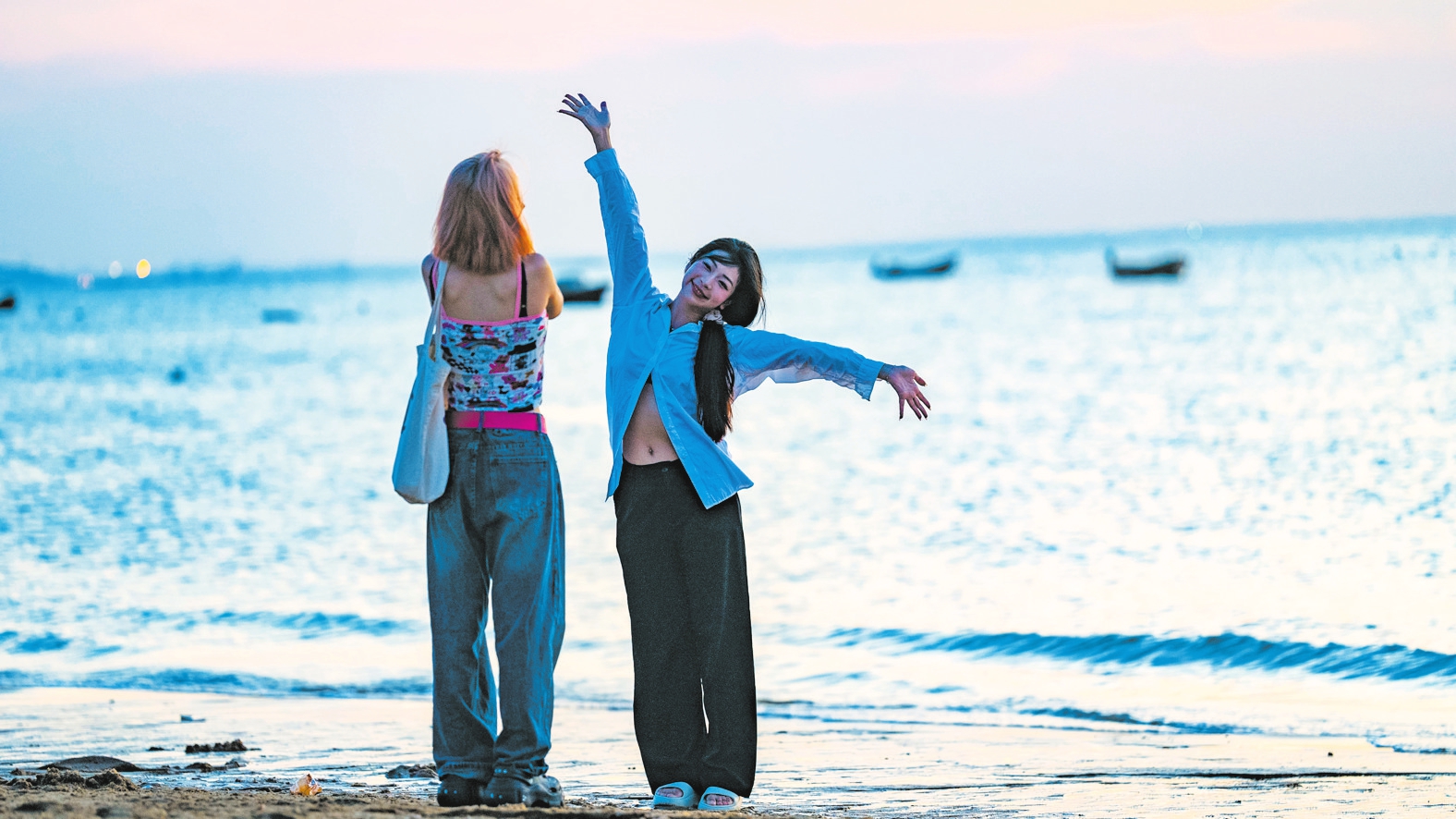 傍晚时分,晚霞映照天际,秀英区荣山寮村沙滩热闹非凡。本报记者 杨忠凯 摄