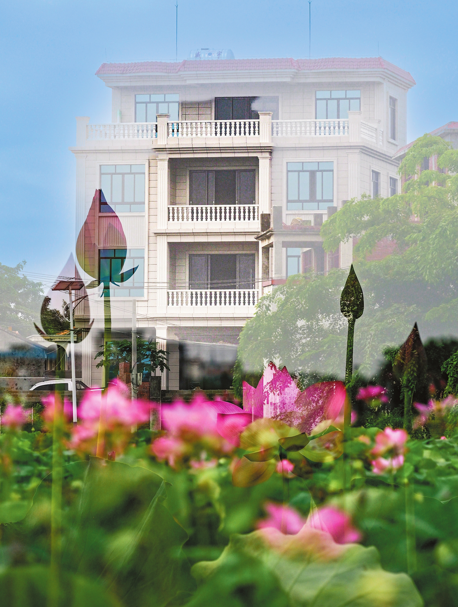 《荷花与农家楼争艳》王梅芬 摄