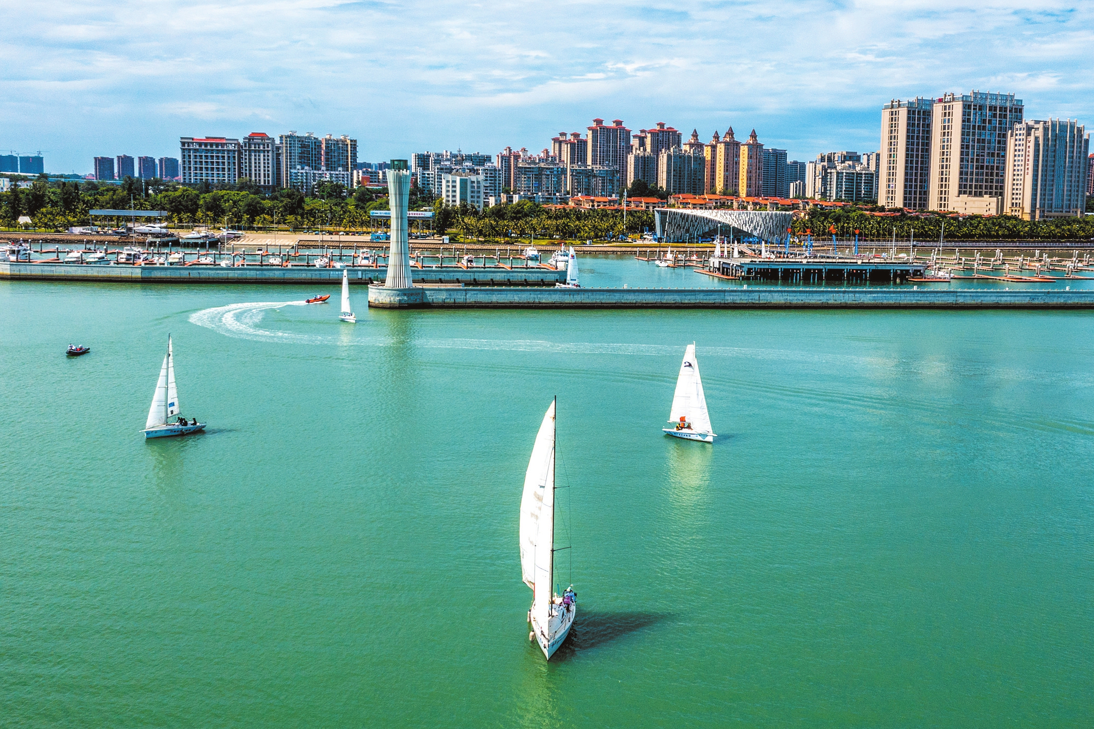①2023海口杯帆船赛在海口市国家帆船基地公共码头举行。图为赛队巡游。本报记者 石中华 摄