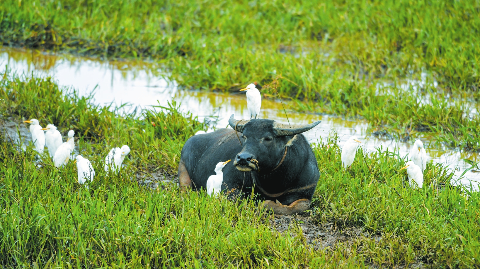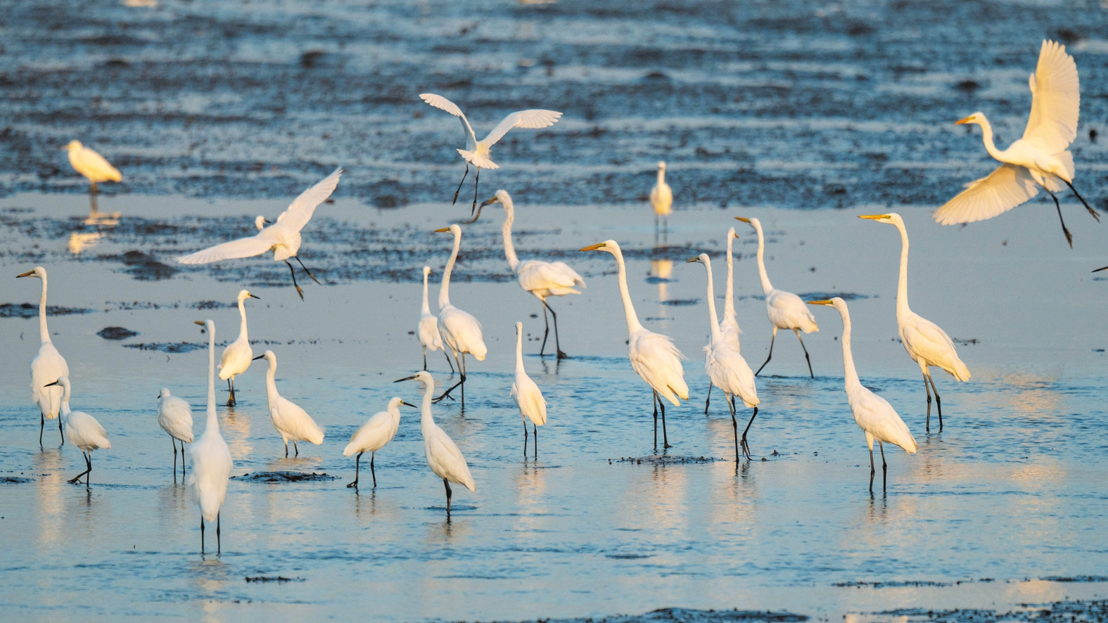 成群飞翔的“鸟浪”,在空中变换队形,为夕阳伴舞,这是什么样的一场“大片”?到了东寨港保护区,去塔市保护站观赏“万鸟归巢”的壮观景象,是观鸟爱好者的“打卡”项目。保护站前是新溪沟,再远处是红树林树岛,浅浅的水沟里聚集了白鹭、苍鹭、池鹭,它们在戏水,在觅食。树鸟相伴,动静互映,画面优美。