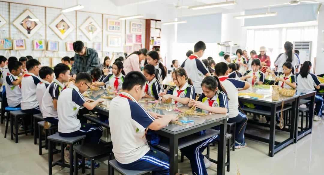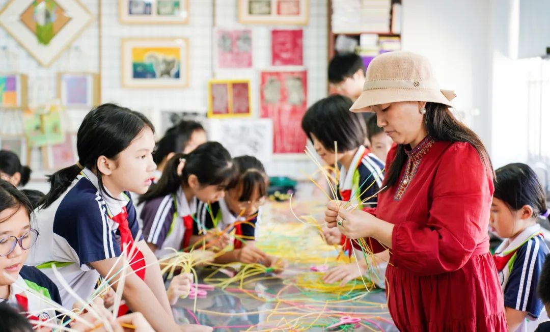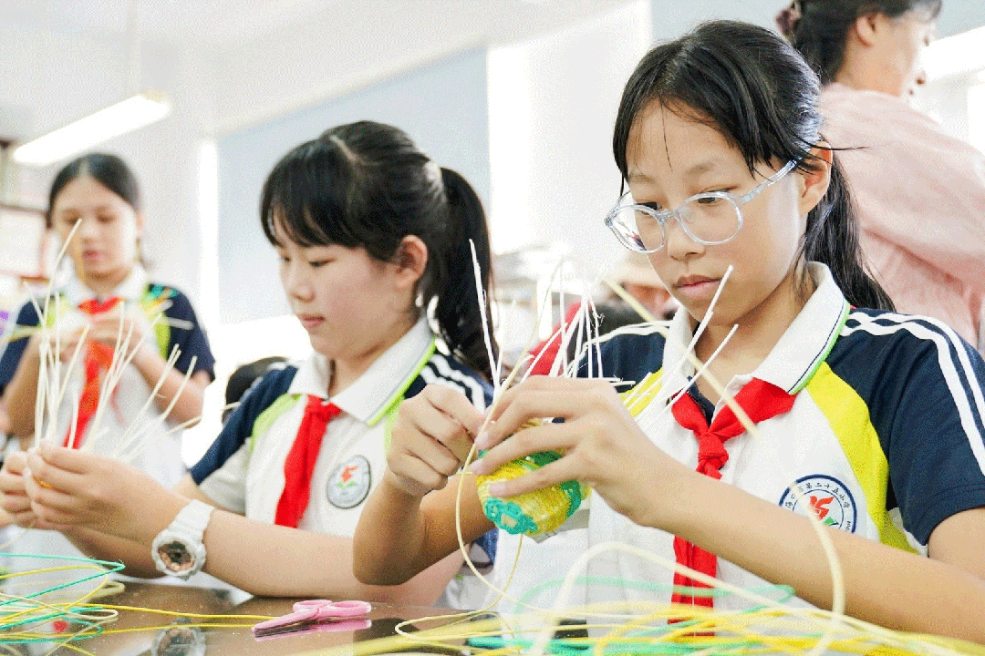 活动现场,非遗技艺传承人讲授了草编、藤竹编和椰雕的发展历史和现状、制作技艺和特征,还手把手教授孩子们藤竹编和草编的技艺,演示了“压一挑一”“挑二压二”等简单的编织手法,孩子们热情高涨,他们认真学习、积极尝试,跟着老师的指导一步一步编织,收获不一样的体验,感受中华文化的博大精深。