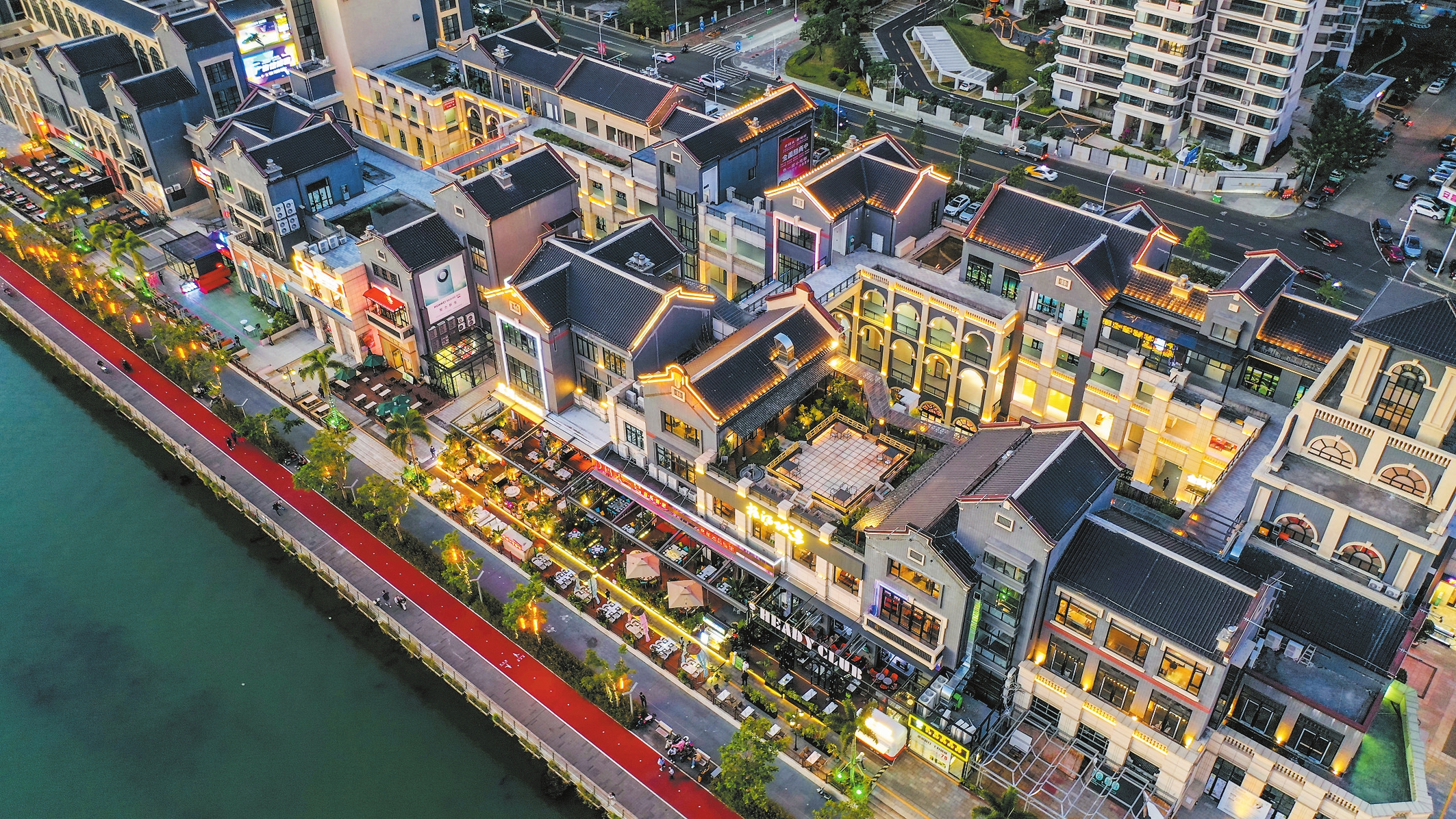 一水之隔的海口东坡老码头风情商业街,古典建筑错落有致,深灰色的墙衣搭配富有年代感的瓦片,别具特色,宛如一艘乘风破浪的“巨轮”。每当夜幕降临,人们在这里一边赏景、一边大快朵颐,好不惬意。东坡老码头商业风情街相关负责人告诉记者,依托之前的老码头特色,将建筑打造成具有传统文化底蕴的海洋风格。