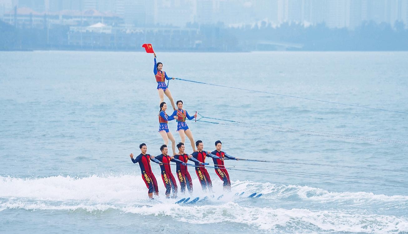 开幕式现场,主办方邀请了国际顶尖滑水表演团队进行精彩的水上表演。飞冲天、后空翻、蛟龙入海、空中旋转等动作令人目不暇接,表演队员们以非凡的胆略和精湛的技术,中流击水,劈波斩浪。花样繁多的空中戏水让人眩目,一个帅气的转体动作再加一个急转弯“蛟龙戏水”,白浪翻腾,呼啸而来。队员们时而聚,时而散,时而相向而行,动作一致协调,场面壮观,令人惊叹。