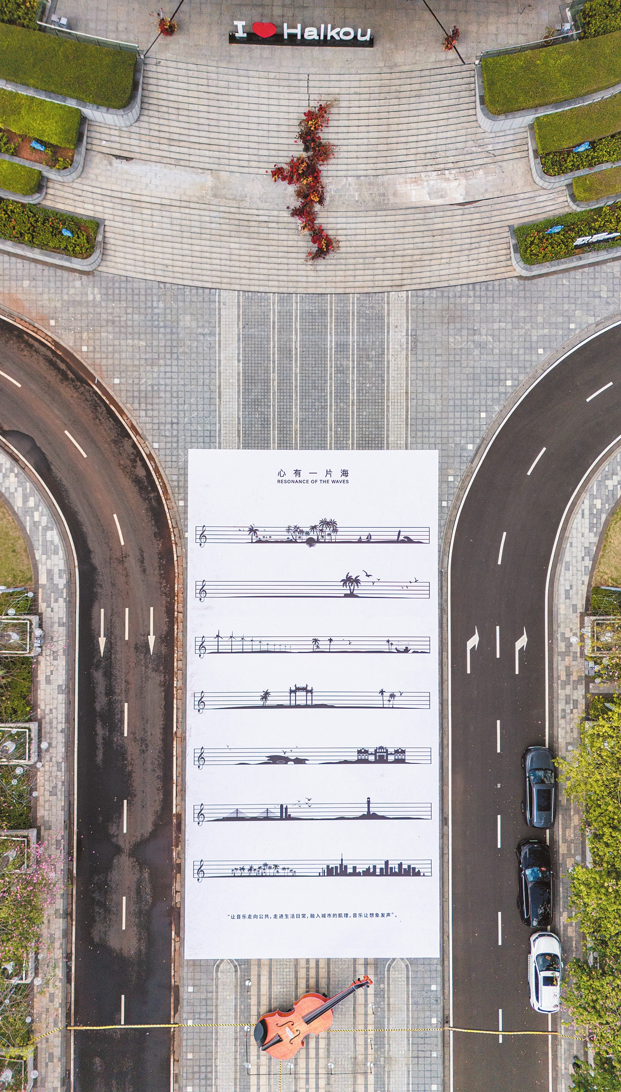12月10日,俯瞰海口湾演艺中心外极具海南特色元素的“乐谱”。