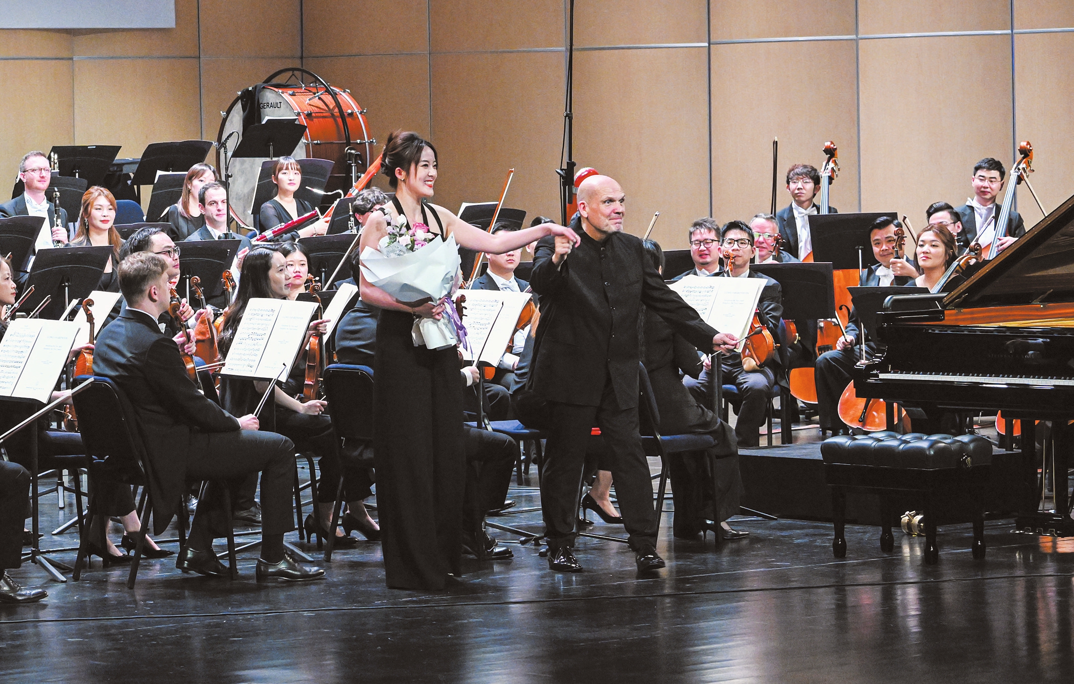 国际顶级指挥大师梵志登携手著名钢琴演奏家万捷旎向观众致意。