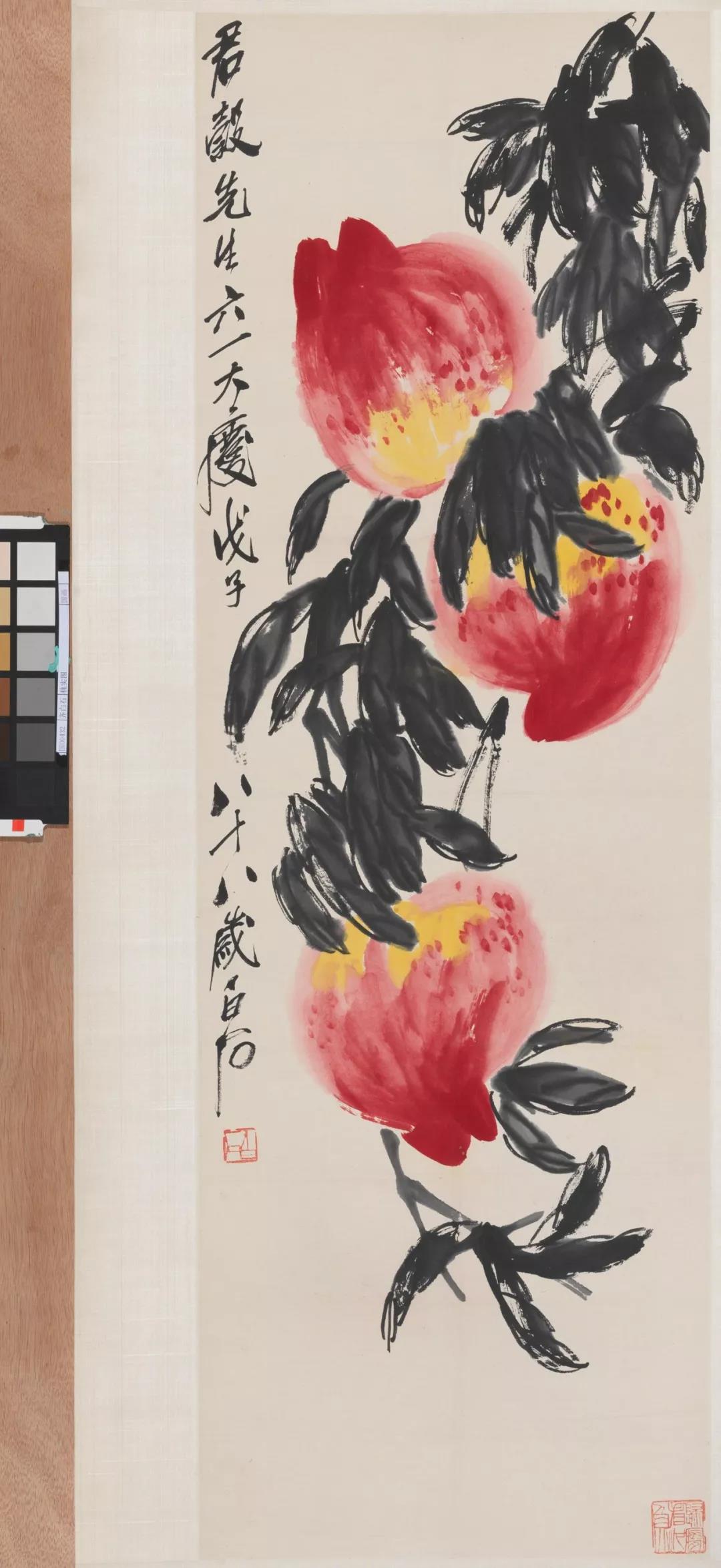 半个世纪以来,上至美术史学界专家,下至普通百姓,论及齐白石对近现代中国绘画的贡献,他的艺术成就都是公认的。他是集诗、书、画、印四绝于一身且闻名中外的巨匠。尤其是绘画,更是 中国近代画史的高峰。此次展览中便展出一幅齐白石1948年创作的《桃实图》。通常所见齐白石画桃,以晚年为多,桃子或画于篮中,或画于树上。多采用“红花墨叶”的画法,先以没骨大写意法直接用洋红泼写硕大桃实,跃然纸上,艳而不俗,惹人喜爱。渗以少许柠檬黄,再以花青、赭墨写出叶子和枝干,后用浓墨勾勒叶筋,设色浓重艳丽。