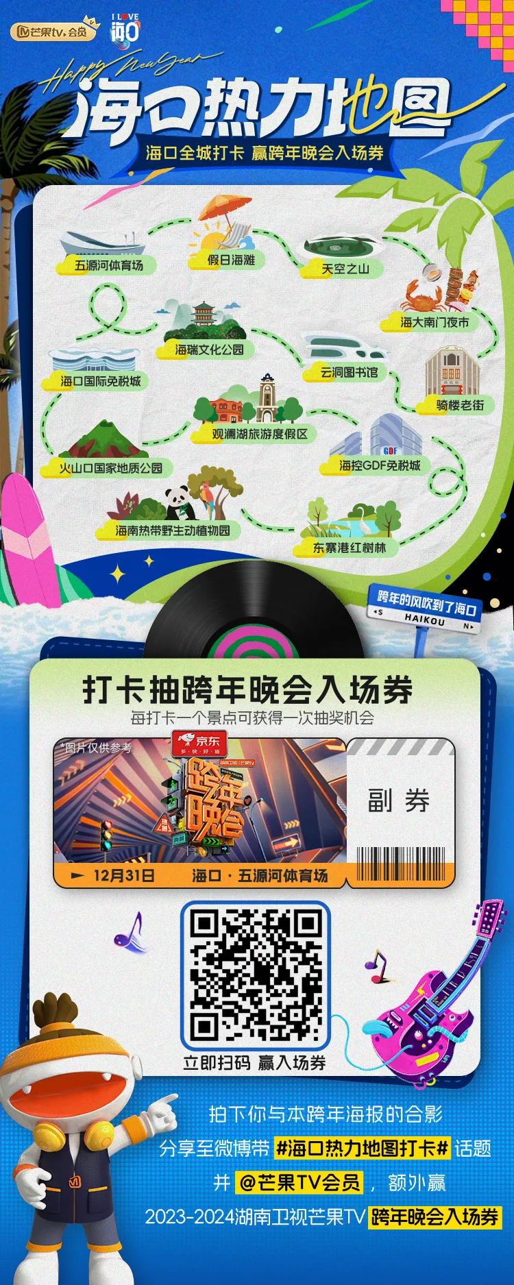 看2023-2024湖南卫视芒果TV跨年晚会,海口邀您全城打卡,赢跨年晚会入场券。打卡假日海滩、天空之山、海瑞文化公园、云洞图书馆、海口国际免税城等12个打卡点位,每打卡一次景点可获得一次抽奖机会;或拍下与本跨年海报的合影分享至微博带 #海口热力地图打卡# 话题,并@芒果TV会员,额外赢2023-2024湖南卫视芒果TV 跨年晚会入场券。