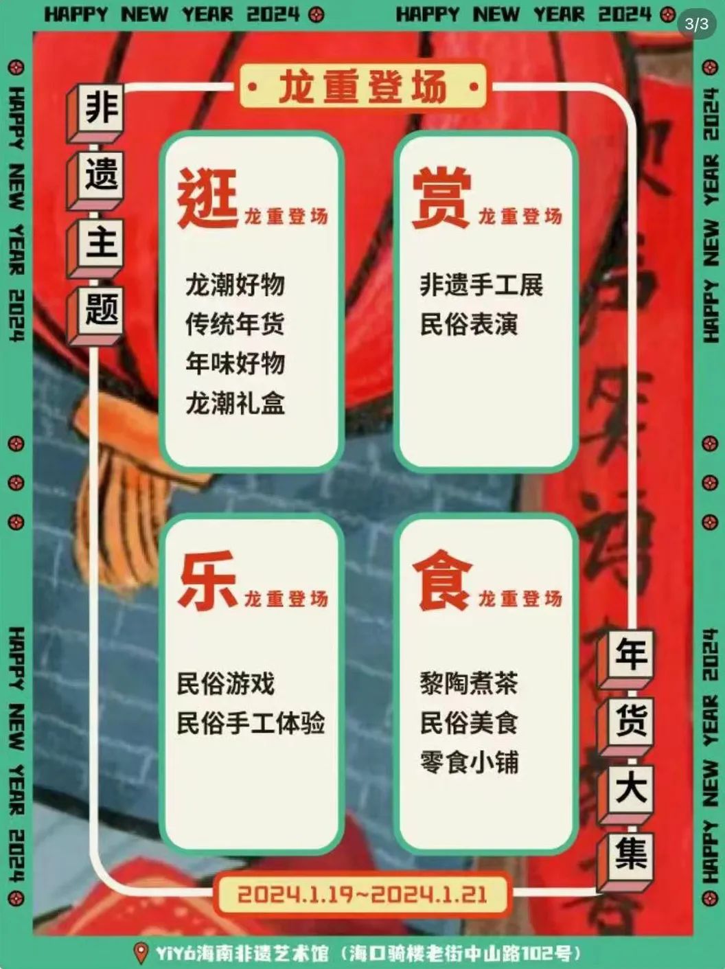 1月19日-21日,海南非遗艺术馆将举办一场非遗主题年货大集,现场将设置民俗美食、非遗文化展、国潮游馆、民俗演艺等区域,带来一场年味十足的新年活动,也欢迎广大市民游客参与,一起品尝海南非遗的美食,体验非遗技艺,寻觅儿时那浓浓年味的同时,感受非遗正当红~