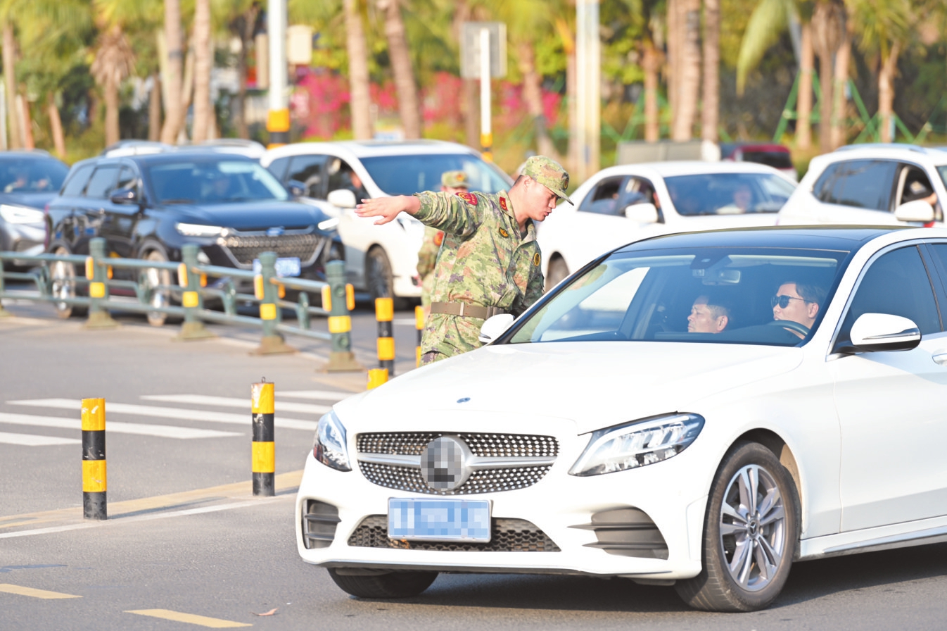 2月4日,在海口新海滚装码头客运综合枢纽站外,民兵志愿者为旅客指引进港路线。本报记者 石中华 摄