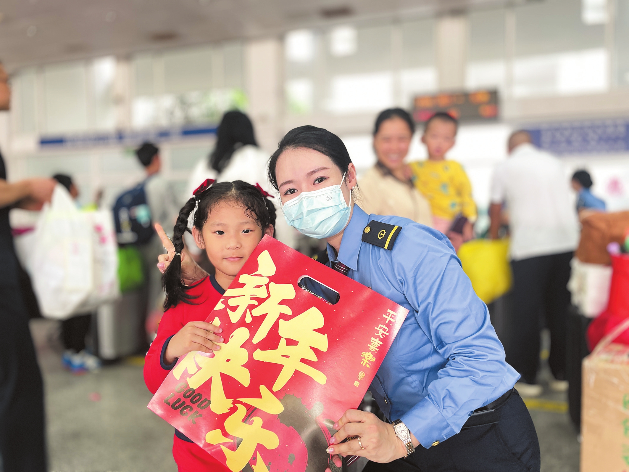 2月6日,海口火车站举办迎新春活动,候车小朋友收到春联后,与工作人员一起合影留念。