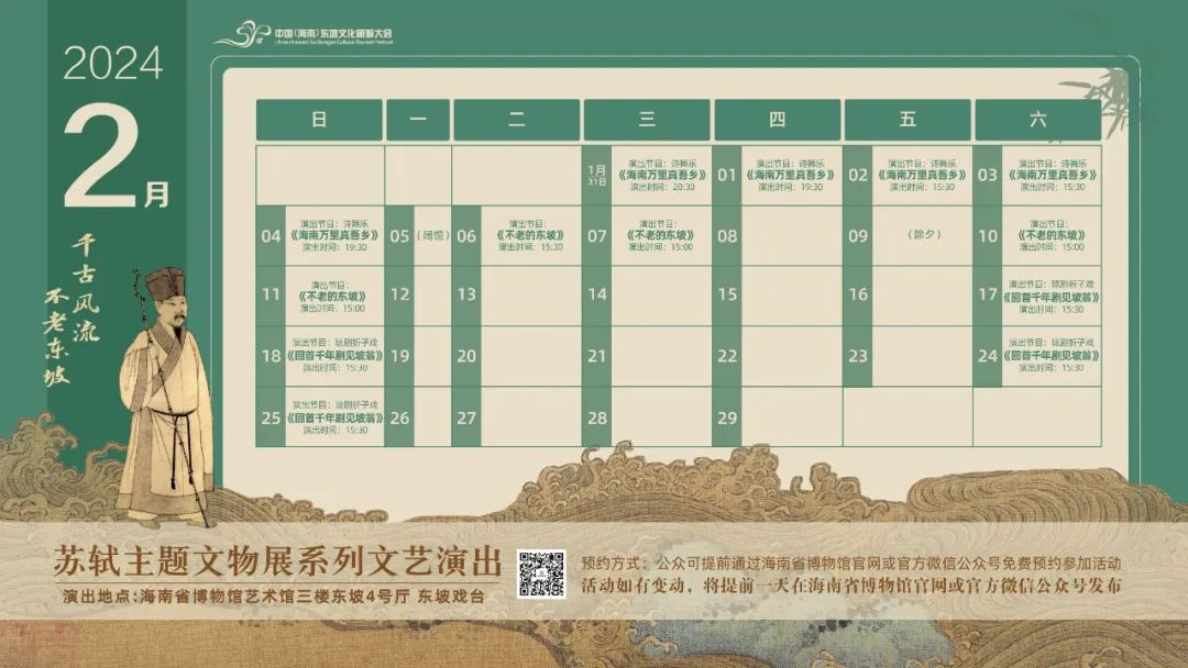 据了解,除了诗舞乐《海南万里真吾乡》外,1月31日至4月28日,系列文艺演出还将向观众献上音舞诗画《不老的东坡》、琼剧折子戏《回首千年,剧见东坡》、民乐演奏《苏东坡主题雅集》等文艺表演。