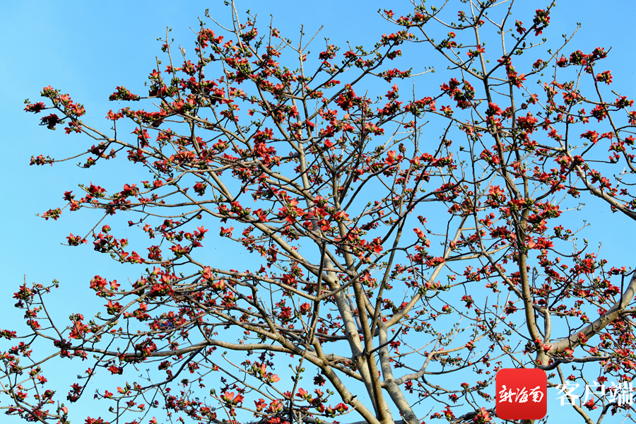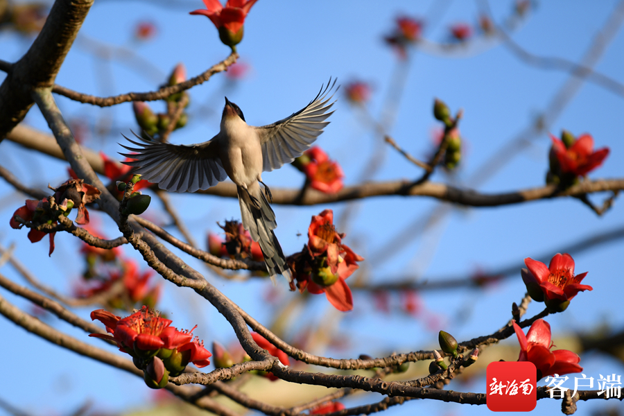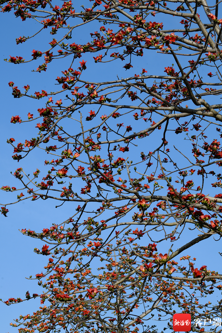 2月18日消息,近日,海口木棉花悄悄开了。18日,记者在万绿园看到,几棵高大的木棉树已经争相开放,鲜艳的木棉花开得如火如荼。小蜜蜂、小松鼠、小鸟都被吸引到枝头上,叽叽喳喳的鸟叫声,仿佛在告诉人们春天已经到来了。